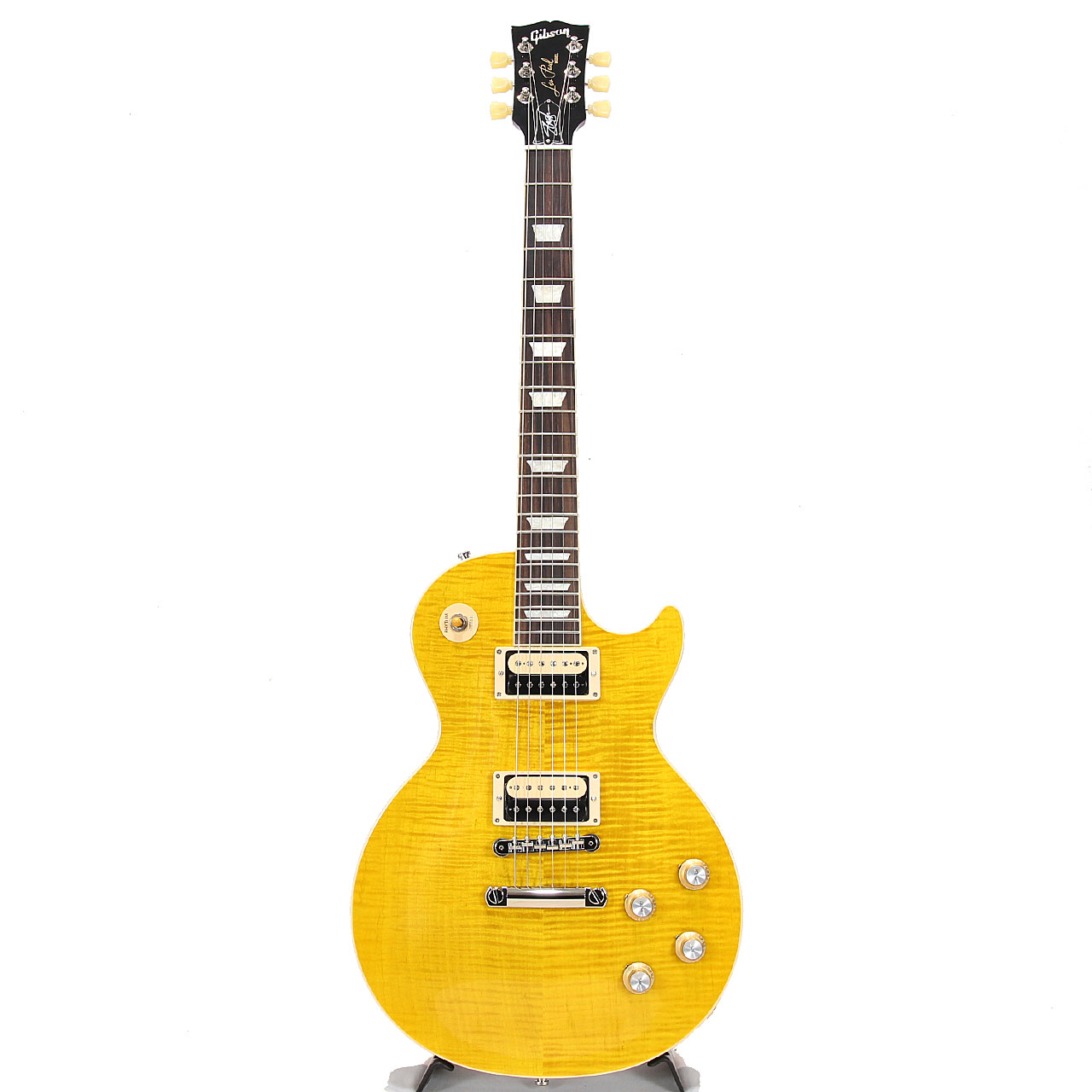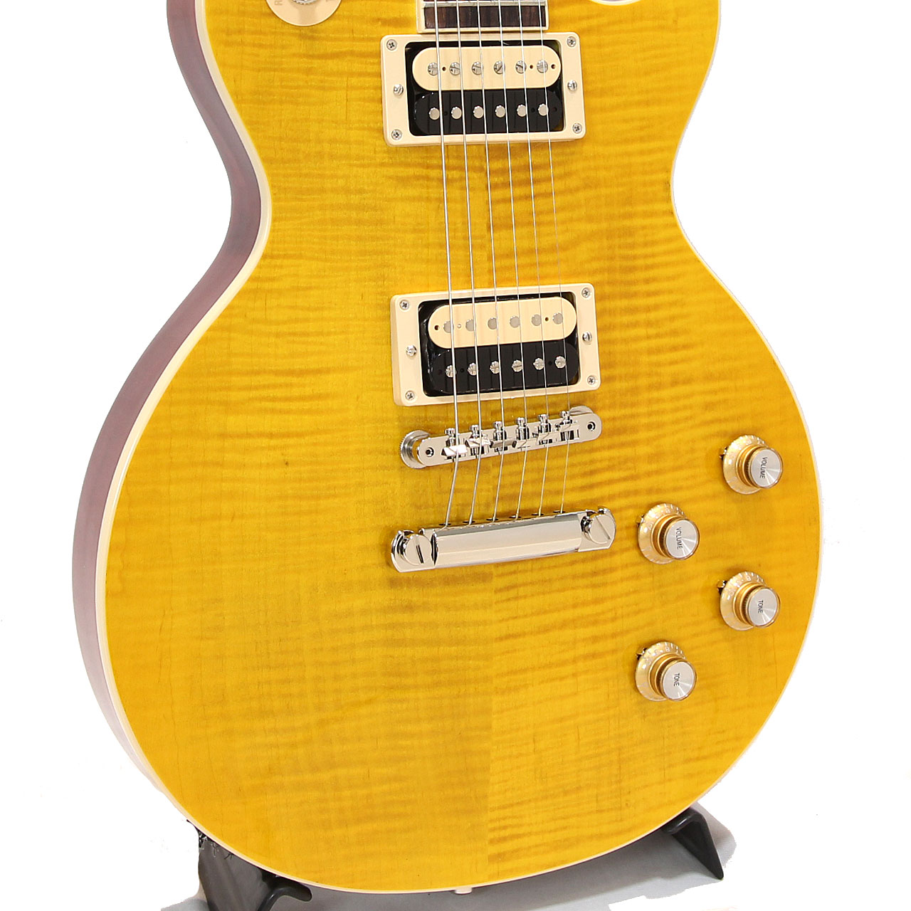 AAAフィギャード・メイプルトップ/マホガニーボディバックは王道のレスポールマテリアル。AAAグレードのフレイムトップはUSAラインナップでも多くなく、美麗なルックスに欠かせません。そしてスラッシュお気に入りのCシェイプ・ネック・プロファイルは握りごたえのある肉厚なネックシェイプながらとっつきにくさは無く長時間のプレイもラクラク可能です。中域のきいた濃厚なトーンをアウトプットしてくれる大きな要因です。
