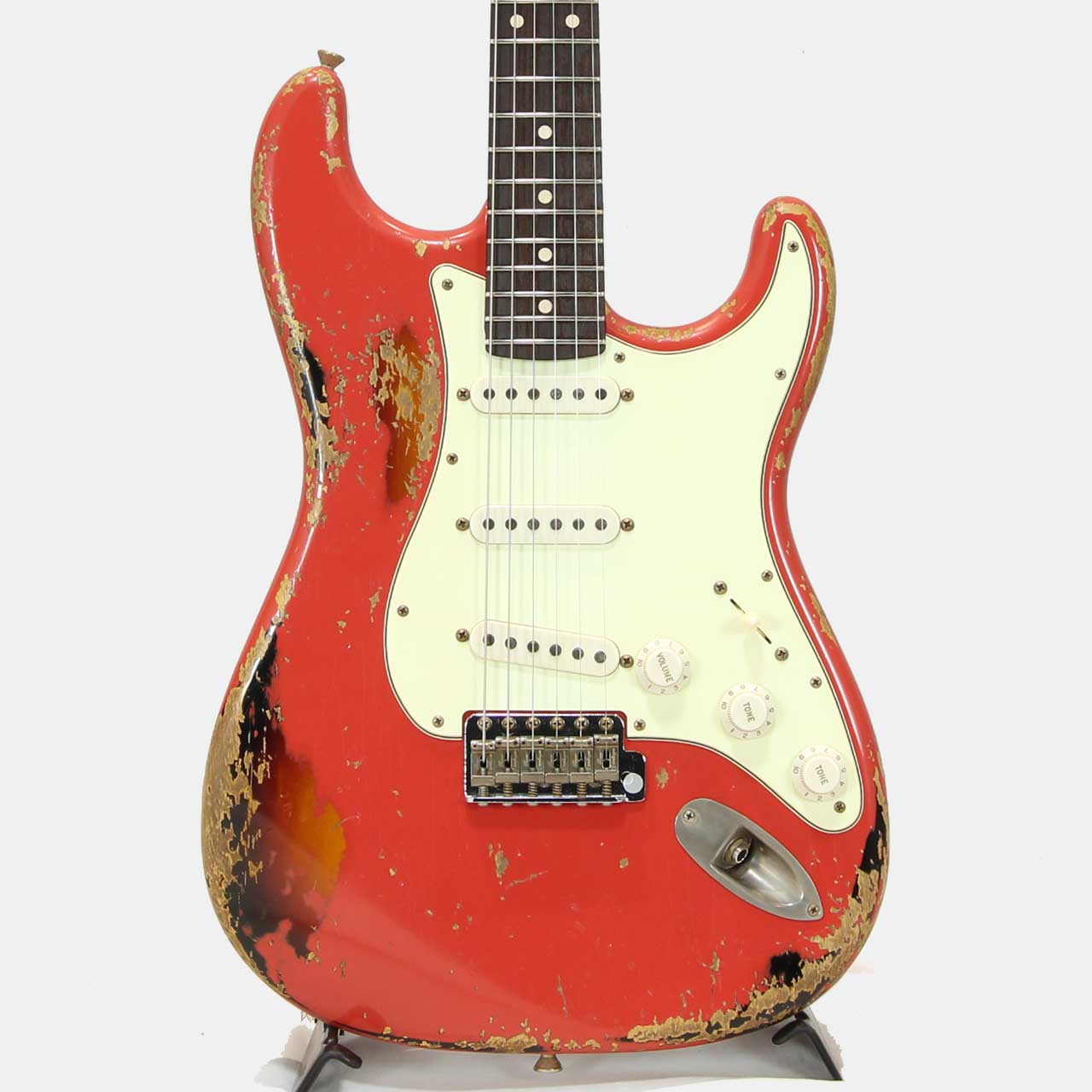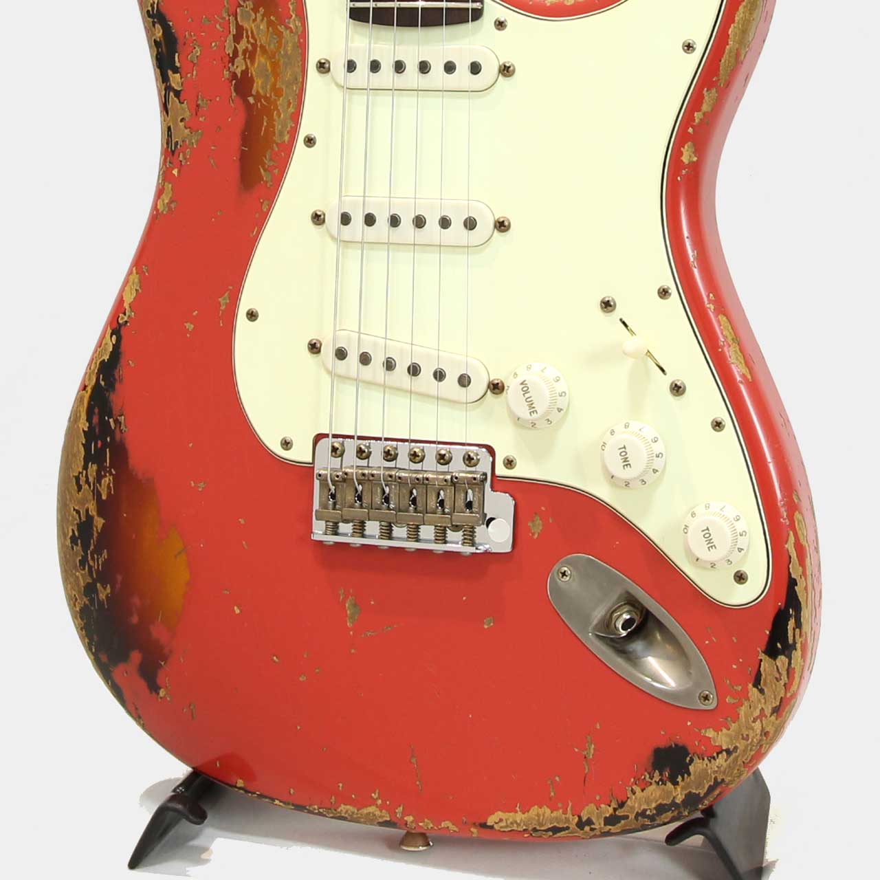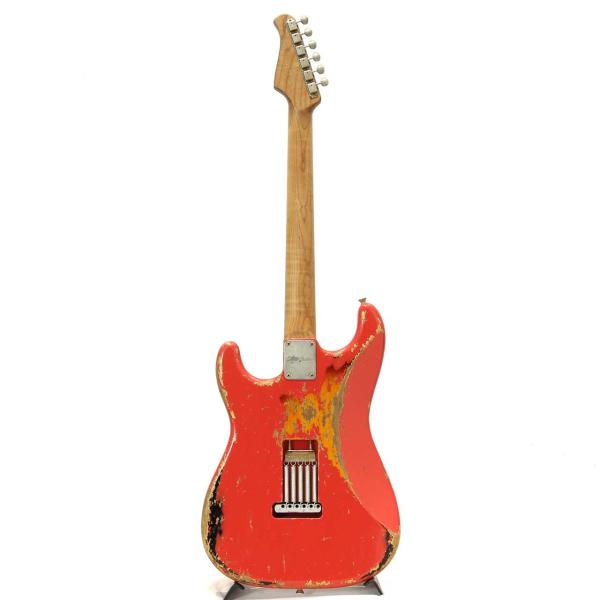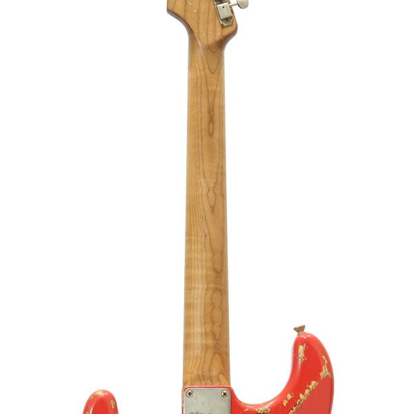 本機は下地にサンバーストカラーを塗装し、その上からフェスタレッドを重ねるマルチレイヤー仕上げを採用。ヘヴィエイジド加工により、経年変化でおーさんターコイズのトップコートが剥がれ、深みのあるグリーンが顔を覗かせることで、一本ごとに異なる表情とヴィンテージライクな風格を生み出しています。