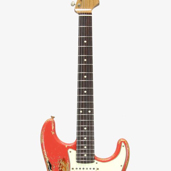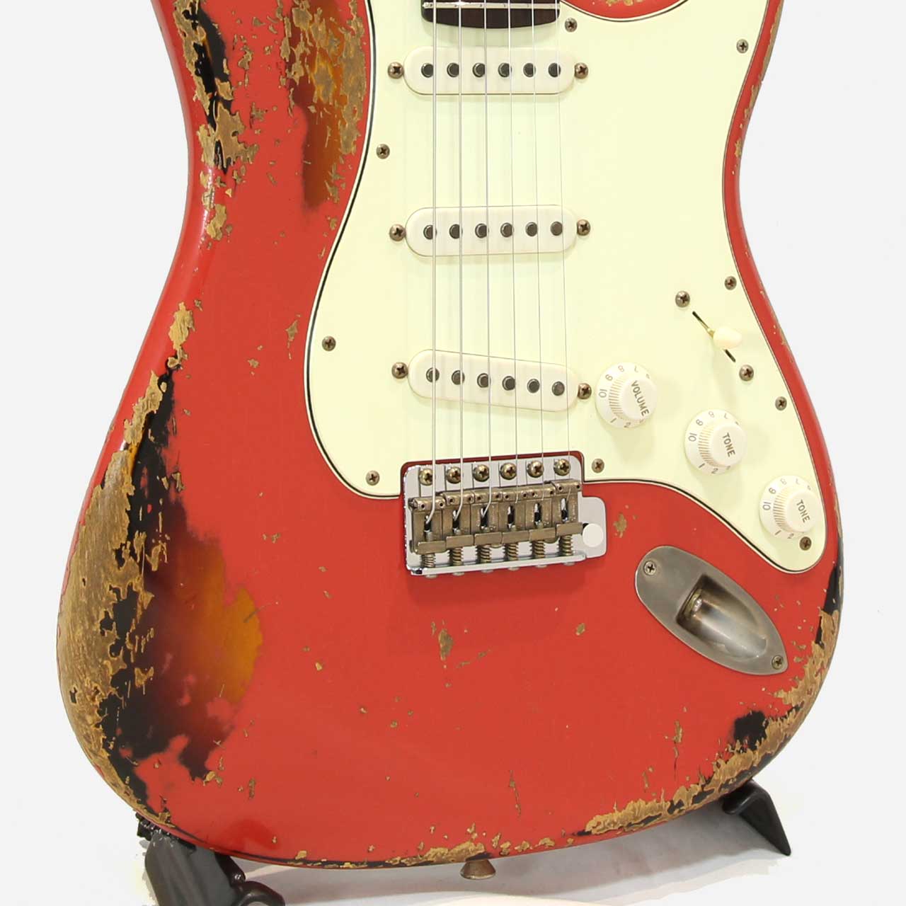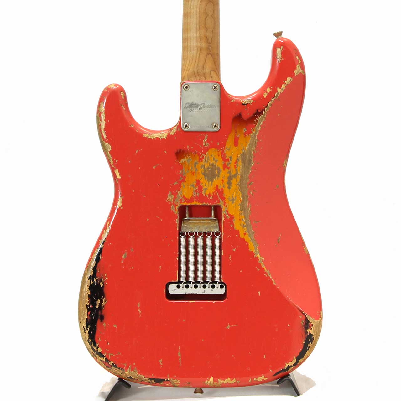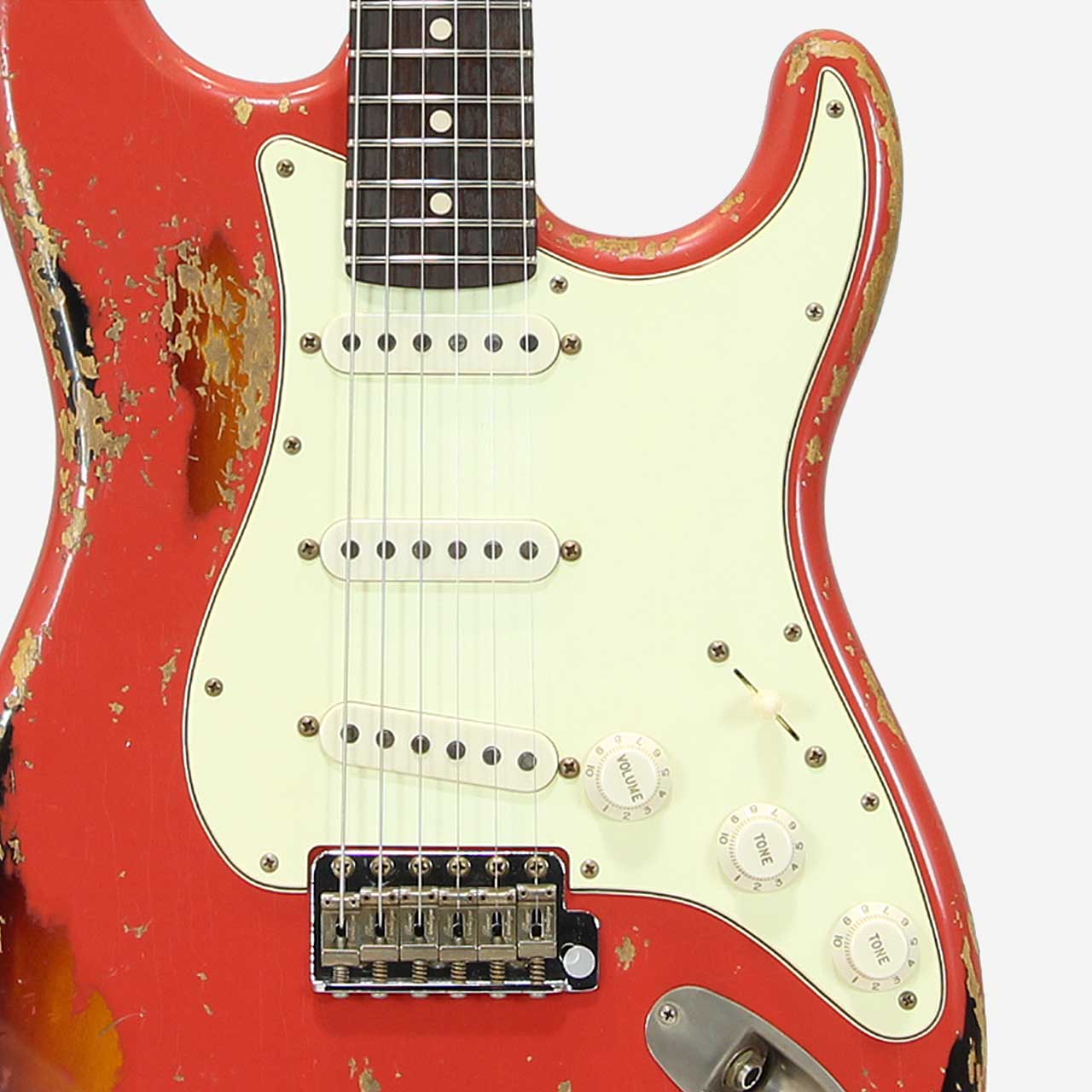 本機は下地にサンバーストカラーを塗装し、その上からフェスタレッドを重ねるマルチレイヤー仕上げを採用。ヘヴィエイジド加工により、経年変化でおーさんターコイズのトップコートが剥がれ、深みのあるグリーンが顔を覗かせることで、一本ごとに異なる表情とヴィンテージライクな風格を生み出しています。