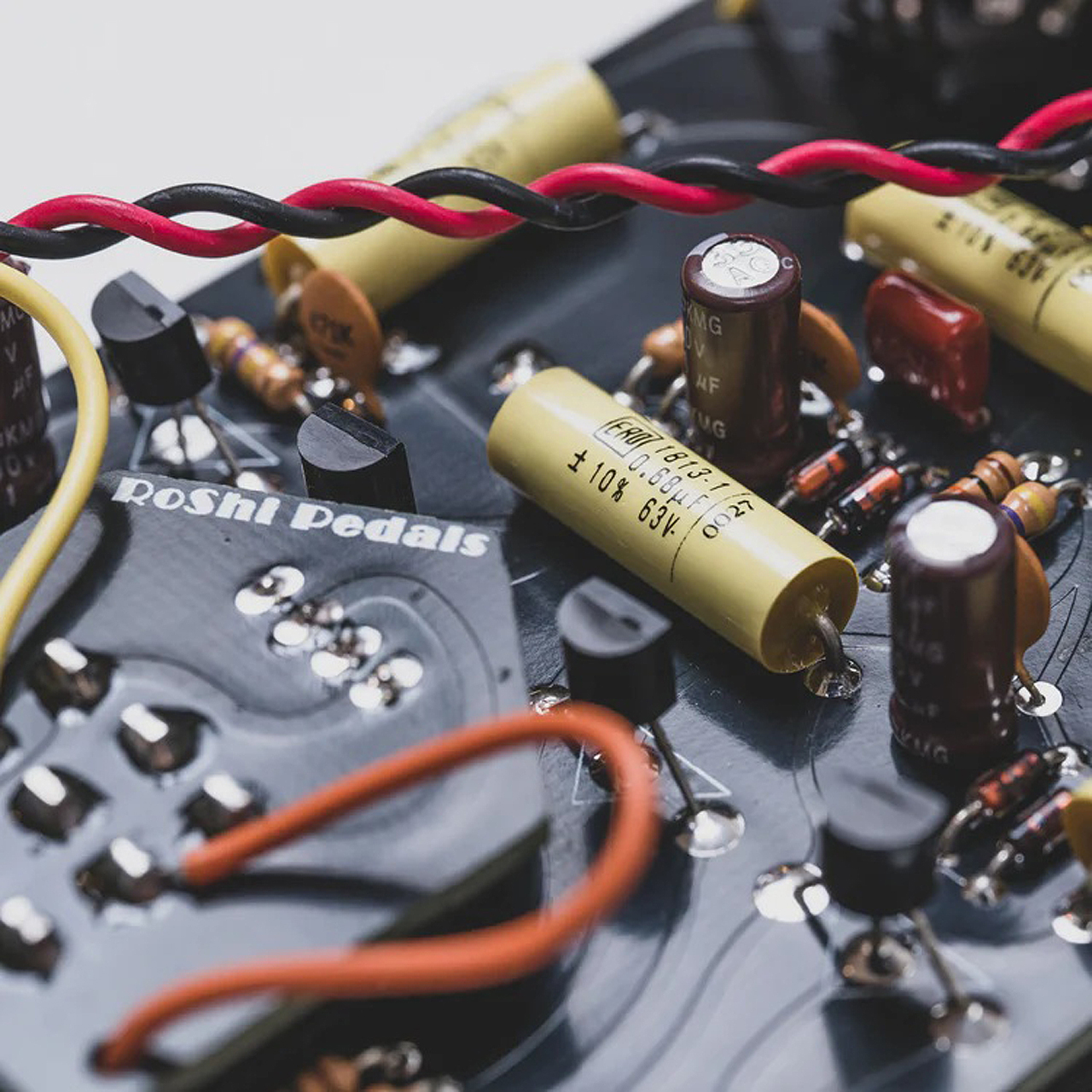 皆さんが気になっているだろうパーツですが、こちらもやっぱり苦労しました。トランジスタは全数測定を行っています。以前から集めていたので余裕で足りるだろうと思っていたら、制作する段階で実際に計測すると全然ほしい測定値がでないんですよ!結局、追加で入手する自体になりましたが必要数をなんとか確保しました。シグナルに大切なカップリングコンデンサには、「GRUFF V1」にも使用したERO社のMKT1813を採用しています。高価なコンデンサですが、見た目や音が気に入っていたので贅沢に採用しています。ポットは大きい方(24mm POT)を採用しています。通常は16mm POTと呼ばれコンパクトでエフェクターでは主にこれが使用されます。しかし24mm POTは曲者で、場所を取るうえに取り付けも手間がかかる。でも24mmの方がかっこいいので、魔が差して採用してしまいました。またカーボンコンポジットの可変抵抗ということもあり、16mmより24mmの方が音もとても良いです。