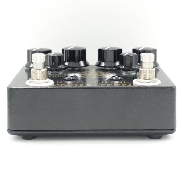 Version 4 King of Toneは、オリジナルの4ノブKoTの各チャンネルを別々にコントロールしたいという多くの要望により、2005年後半に開発されました。オリジナルのKoTは1つのオーバードライブ・サーキットで、2つのチャンネルがあり、別々のボリューム・コントロールと内部コンフィギュレーションを持っていました。ほとんどの 「デュアル・オーバードライブ 」ペダルはこのようなものです。Ver4 KoTは、1つのボックスに2つのオーバードライブペダルが左右に1つずつ入っています。各側面が独立したペダルであり、DIPスイッチの設定方法以外は同じであることを覚えておいてください。各側面には、オン/オフスイッチ、LED、3つの独立したノブがあります。また、各サイドにはDIPスイッチとTREBLEトリム・ポットがあります。実際のオーバードライブ回路を2つ搭載しているため、両方のペダルを直列(スタッキング)に使用することで、さらに多くのトーンとドライブ・レベルを得ることができます。