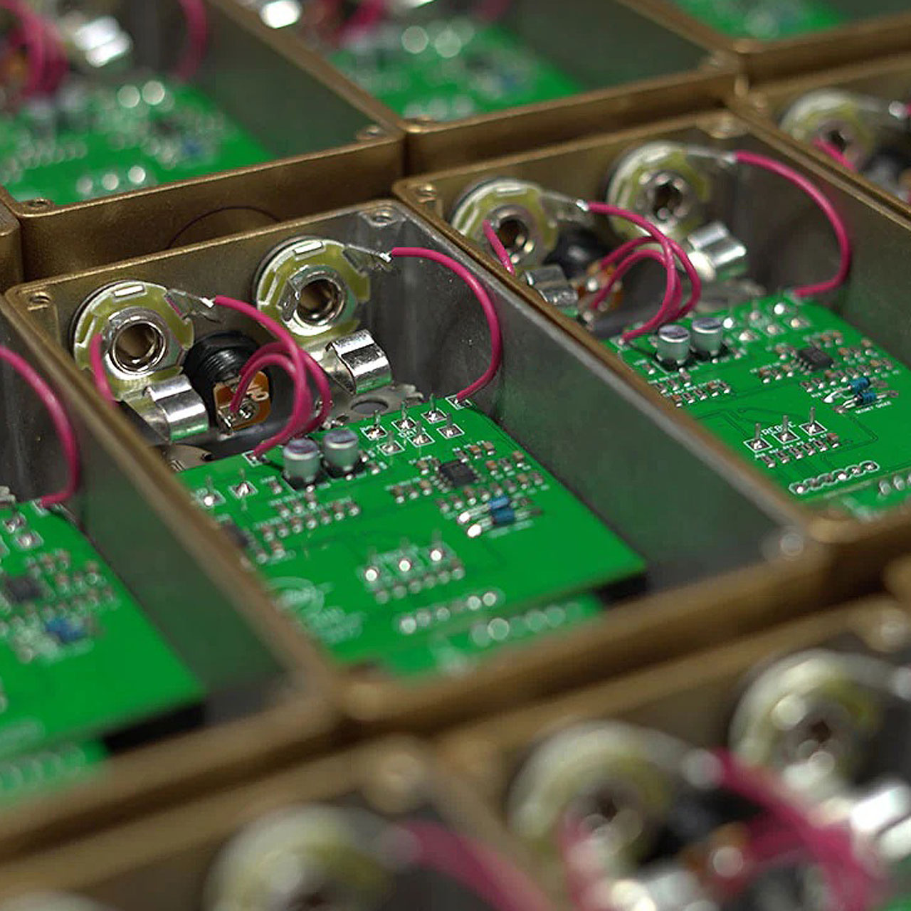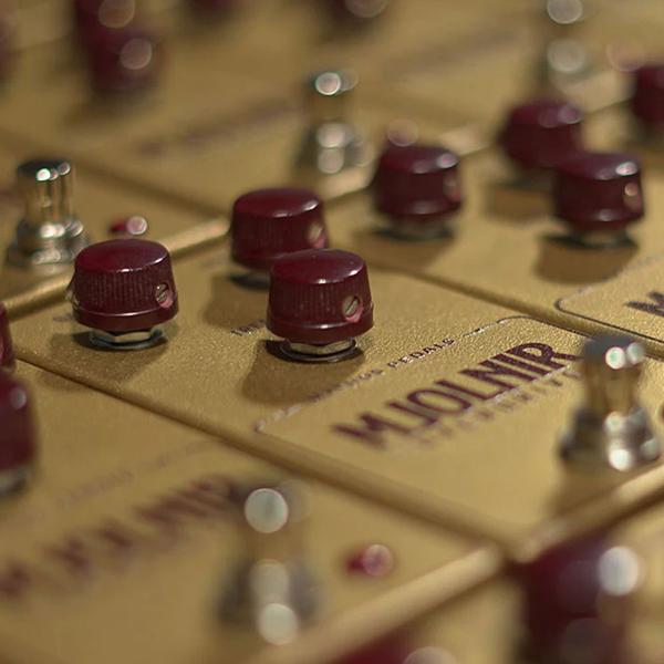 Mjolnir(ミョルニル)は、「Horsey-Man」ペダルを当社独自の解釈で再現したものです。2010年以来、当社はこの回路を、好みや嗜好に関係なく、すべての人に使えるように改良してきました。他の「klon」と比較すると、ゲインが少し低く、中音域の響きが少なく、低音域の押し出しが強いです。回路の象徴的な部分はそのまま残っており、ペダルの広い世界の中で本当に際立っています。