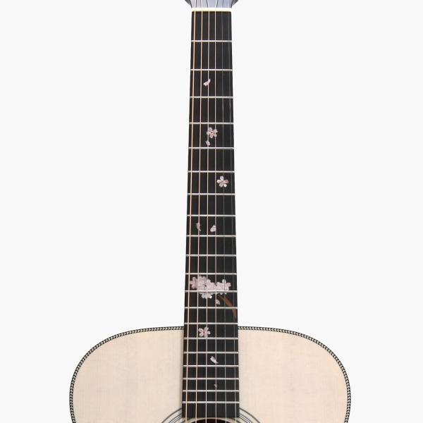 指板には桜の花びらを模ったインレイが美しく彩ります。通常のポジションマークをもつギターから持ち替えても違和感が少ないよう、桜の花びらの配置を考慮しています。