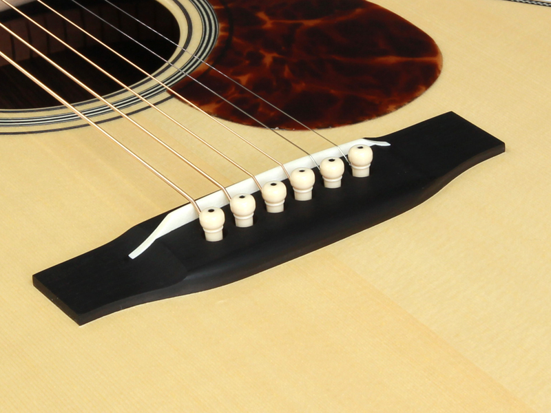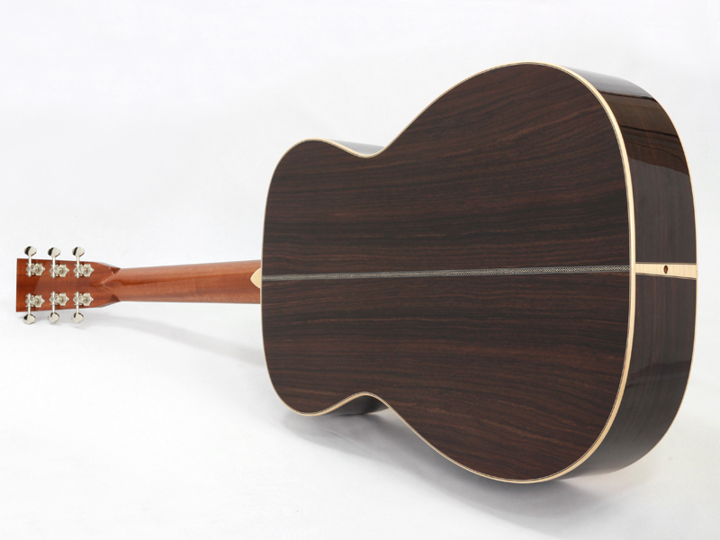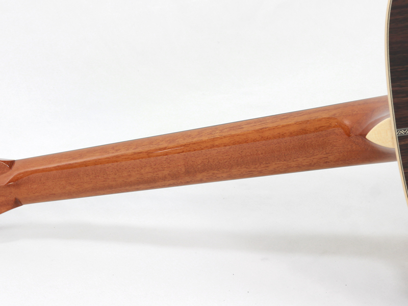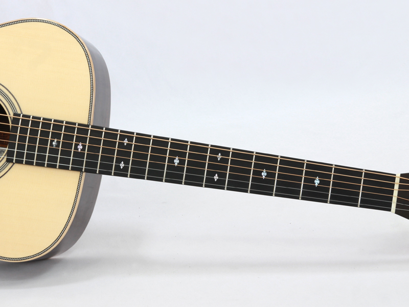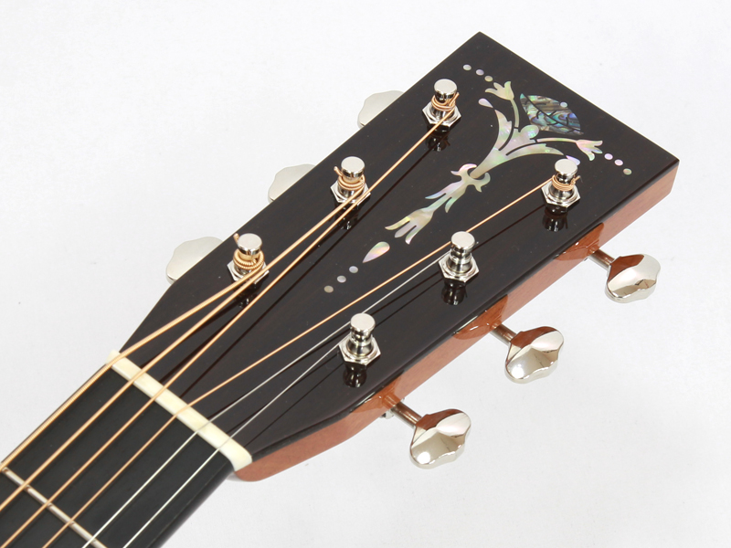 イングルマンスプルース材単板トップ、ローズウッド材単板サイド&バック、マホガニー材ネック、エボニー材指板&駒、43mmナット幅に 645.2mmスケールのスペックとなります。
