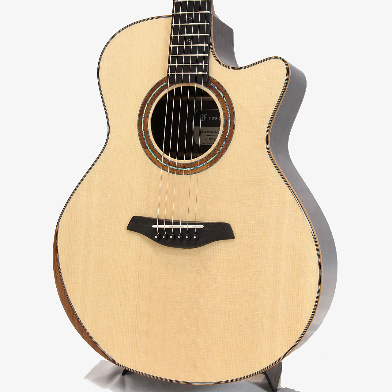 こちらの商品は大人気のイエローデラックスをベースに、ハワイアンコア材のBevel Duo&バインディング、FG01と同じPremium solid koa and abalone ringのロゼッタを施したYellow Deluxe Gc-SRの本数限定モデルです。