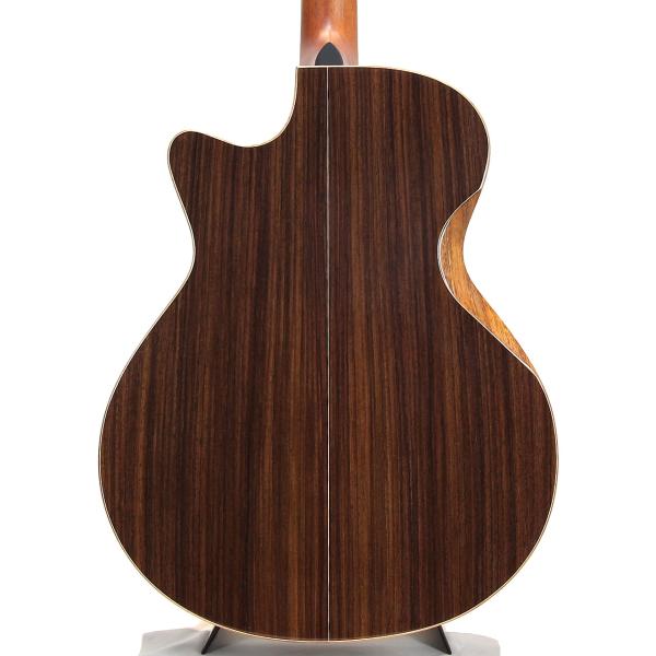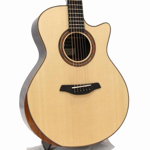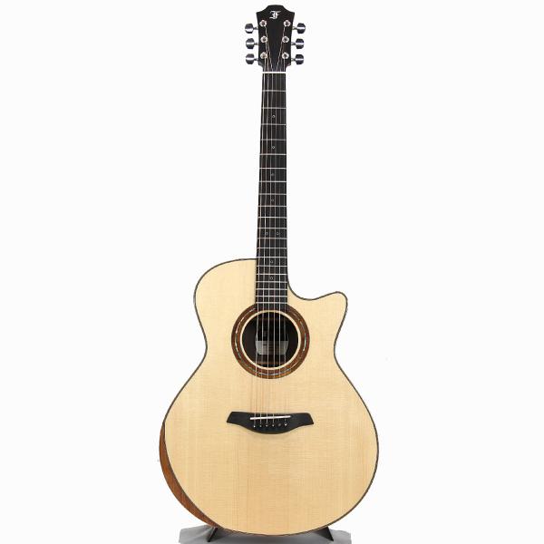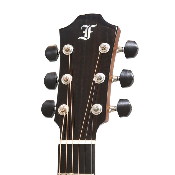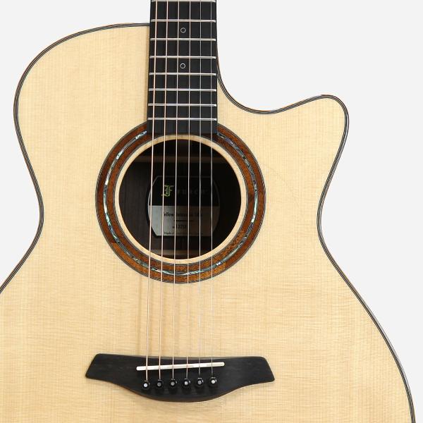 豊かな生鳴りを楽しめるグランド・オーディトリウムのボディを元に、トップ材はAAAグレードのシトカスプルース、サイド&バック材はAAグレードのインディアンローズウッドを採用し、こちらも同じくFG01と同じハワイアンコア材のBevel Duoが施されております。また、ロゼッタのデザインはPremium solid koa and abalone ringとなっており、美しいハワイアンコア材とアヴァロンの美しいラインが大変魅力的なルックスとなっております。その他スペックは、マホガニー材ネック、エボニー材指板&ブリッジ、ナット幅は45mm、GOTOH 510ペグの仕様となっております。
