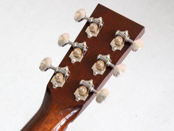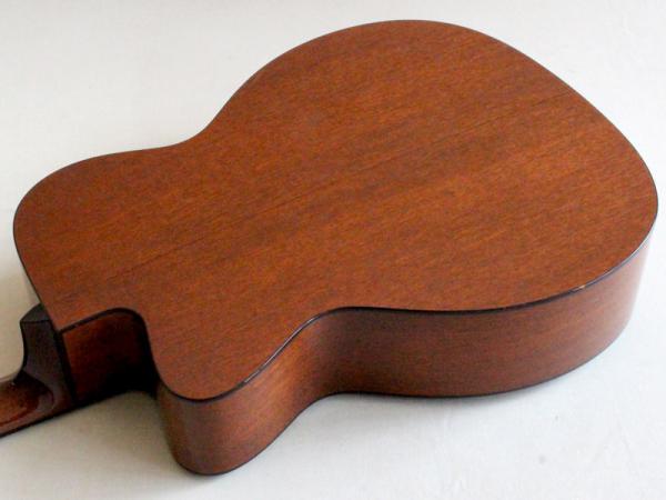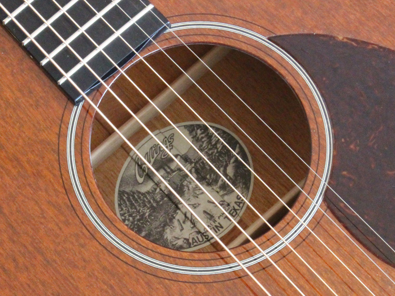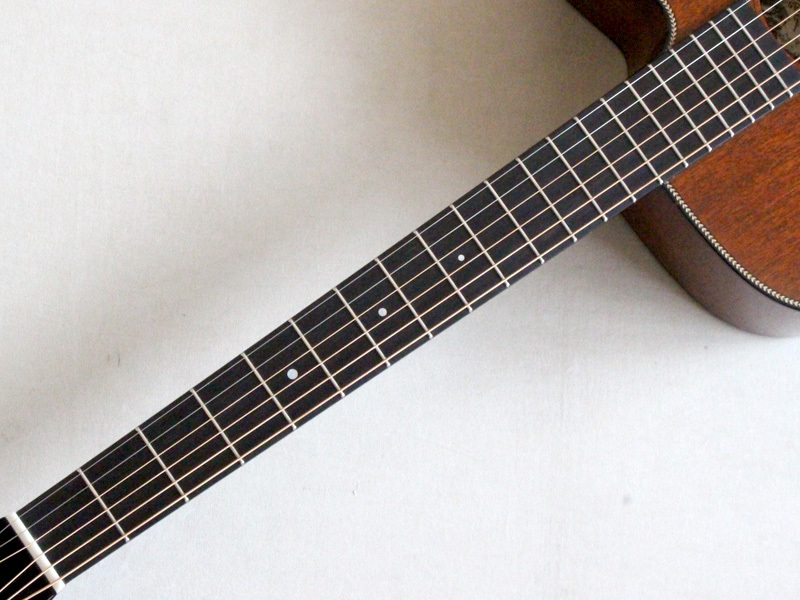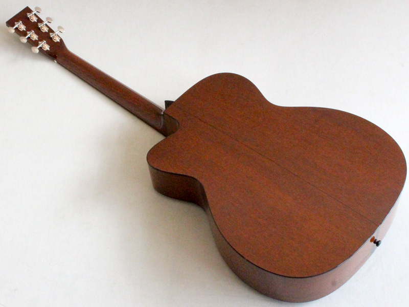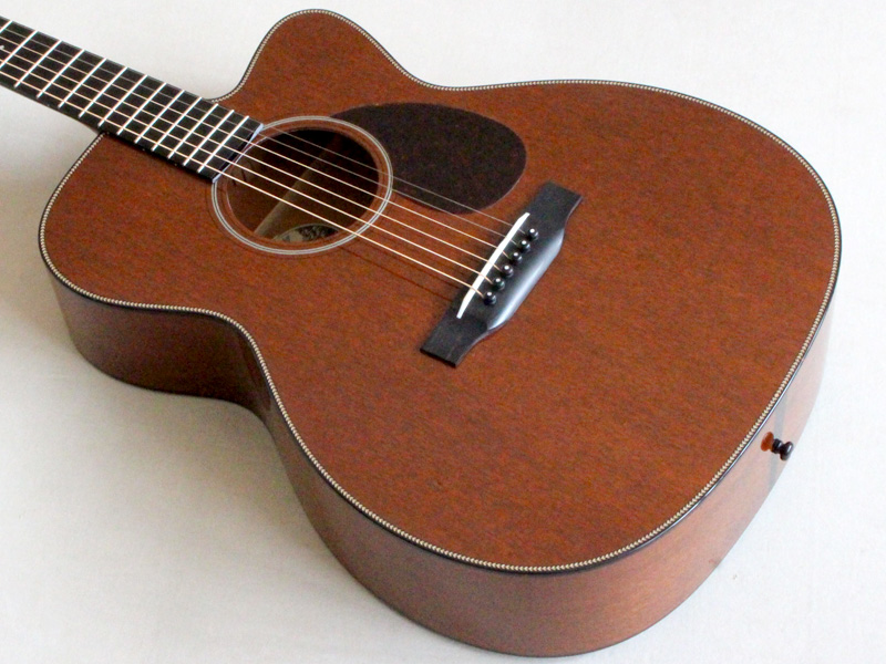 スペックはOMのカッタウェイ仕様に、ホンジュラスマホガニー材TOP、ホンジュラスマホガニー材SIDE&BACK、ホンジュラス・マホガニー材NECK、エボニー材指板&ブリッジ、42.9mmナット幅、約648mmスケール、Nickel Waverlyペグ、トートイズ・バインディング、ヘリンボーントリムと、ルックスも非常に良いカスタム品に仕上がっております。
