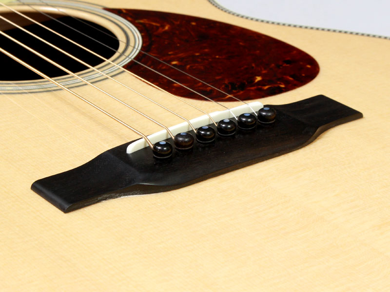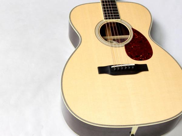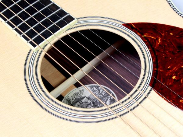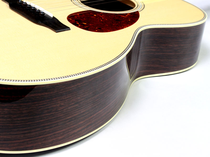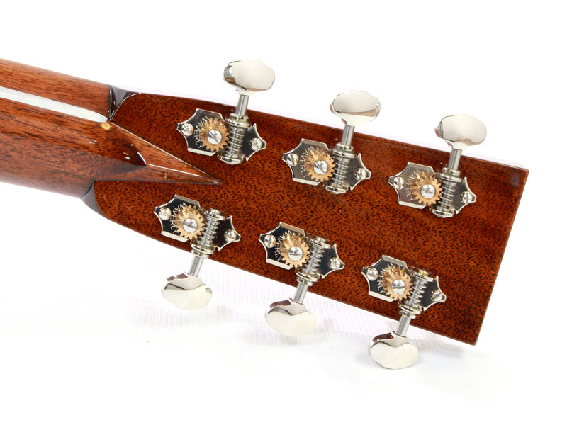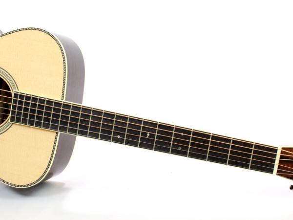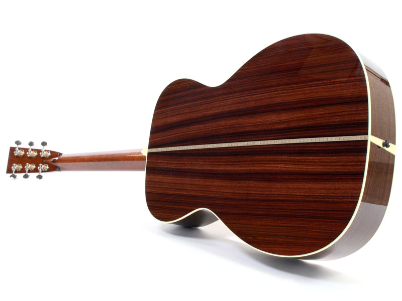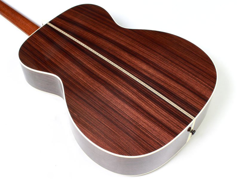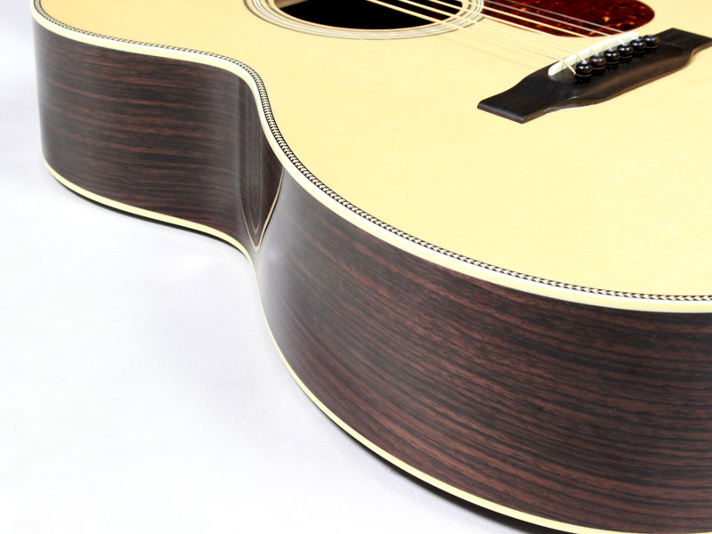 シトカスプルース材TOP、インディアンローズウッド材SIDE&BACK、ホンジュラスマホガニー材NECK、エボニー材指板&ブリッジ、44.5mmナット幅、約648mmスケール、Nickel Waverlyペグ、アイボロイド・バインディング、ヘリンボーントリム、ジグザグバックストリップ、そしてStyle3と呼ばれるネックからヘッドにかけてのアイボロイド・バインディングが特徴的となります。