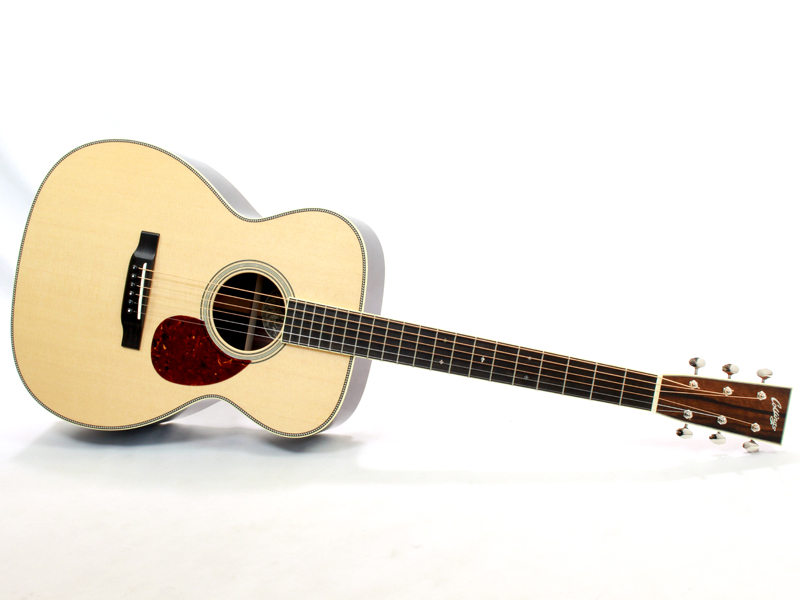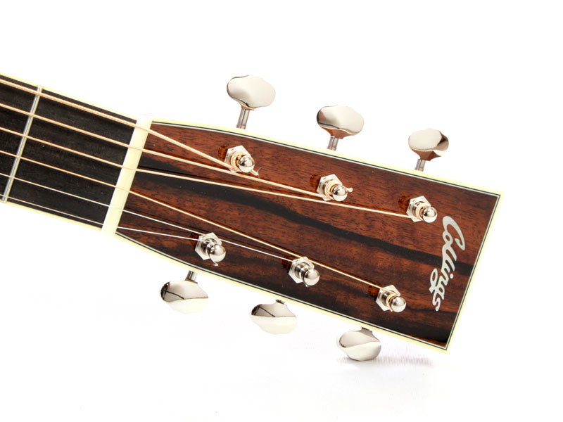 端正で美しいルックスそのものと言ったサウンドで、クッキリと伸びやかで音飛びの良い出音と、プレーン弦のハイポジションまでしっかりと鳴ってくれる作り込みの良さは流石はコリングスです。音色に芯はありますが硬さはなく、非常に豊かな胴鳴りで素晴らしいバランスの1本です。OMとは思えないほどローエンドもダイナミックに鳴ってくれますし、もちろんタイトさはありますので非常に扱いやすいと思います。ナット幅は44,5mmですが、エレキからの持ち替えも容易なほどに握りやすいネックシェイプで、キースが好んで使用しているのも頷ける仕様となっています。
