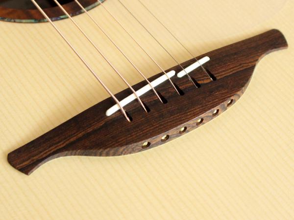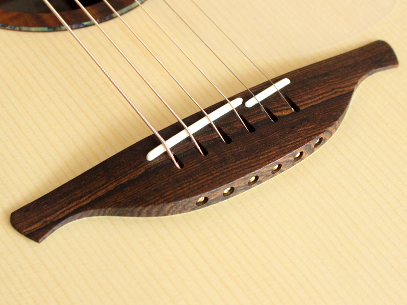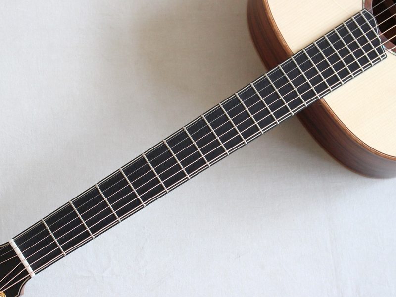 純白のマスターグレードのアディロンダックスプルース、マスターグレードのマウンテンローズウッド、5ピース・マホガニー材ネック、エボニー材指板、44.5mmナット幅、650mmスケール、タスマニアンブラックウッド材バインディング、ベベルコンター、GOTOH Gold 510ペグ、フィンガースタイルにピッタリな大変魅力的なスペックです。