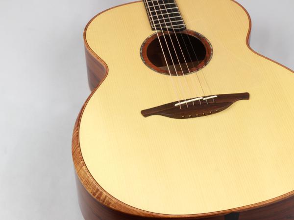 Lowdenらしい荘厳なリバーブ感とOサイズのボディ特有のエアー感と豊かな低域が魅力。特にアディロントップの芯のハッキリとしたトルクある出音がとても気持ちいいです。サイドバックのマウンテンローズはクリアな音色が持ち味で、弾き終わりの透き通った、ややキレのある音色は絶品です。コンター搭載ですのでとても扱い易く、フィンガースタイルならどのようなジャンルにも馴染める懐の広さがあります。