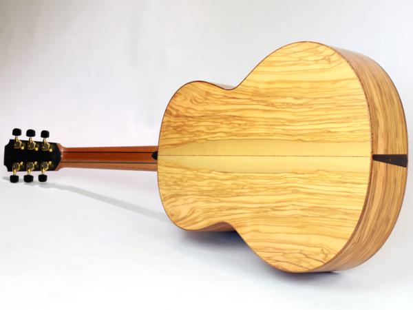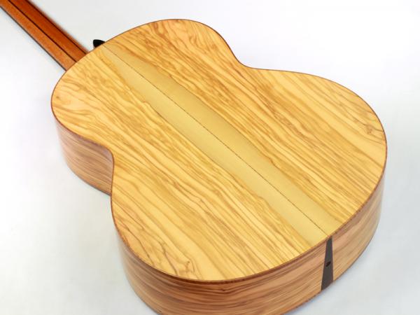 プロトタイプとして制作されたこちらのオリーブ材のSIDE&BACK。オリーブはモクセイ科で硬めの木材。実際ローズウッドぐらいの重量はあり、音色も近いものがあります。オリーブの方がやや明るく、ローズよりもくっきりとした音色のように感じます。実際こちらのモデルのサウンドは素晴らしく、やや硬質で明るい音色のオリーブ材の特性を、アルパイントップが表情豊かに捉え、多彩な表現を可能としております。