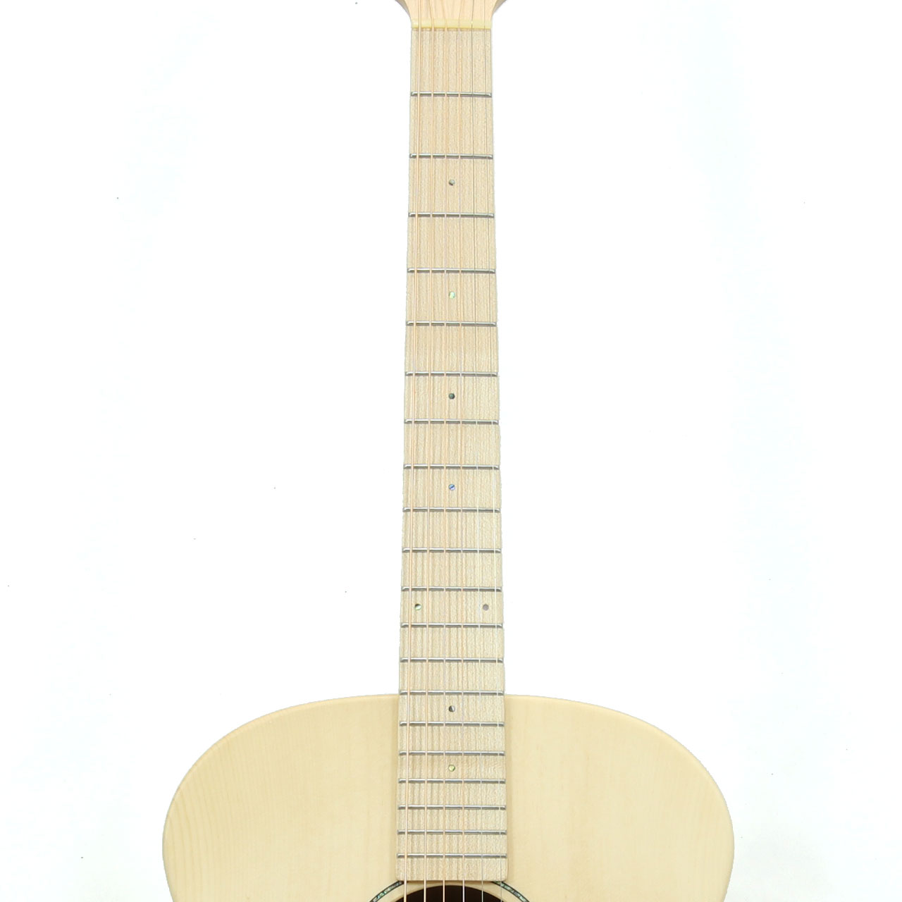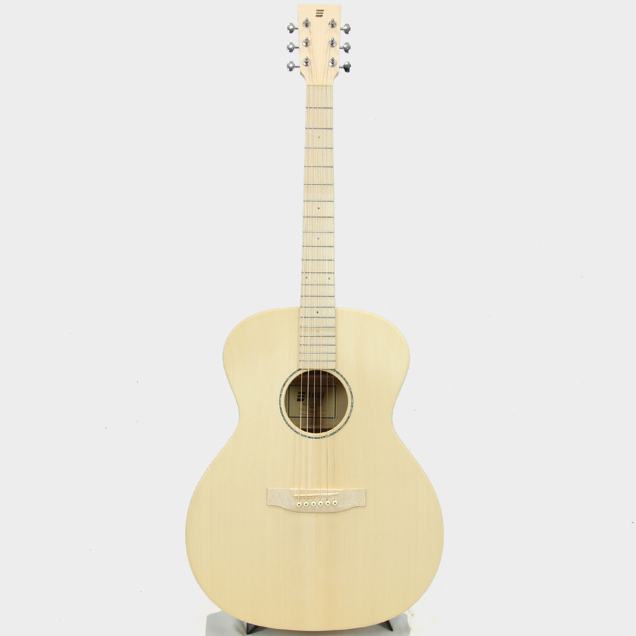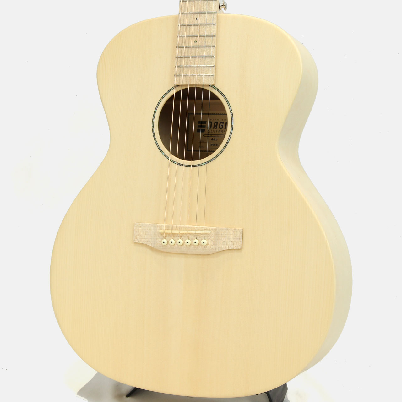 ネックはメイプルとエンジニアードエボニーの5ピース材を使用し、ギターの特性上で必ず起こりうる反りに対処しています。ナット幅は44mmと一般的なサイズですが、ネックグリップは薄めで手の小さい方でも安心してお使いいただけます。指板とブリッジはメイプルを使用し木材本来の色味を生かしたナチュラルな装い。ポジションマークにはロゼッタ同様にアバロン貝のスモールドットを採用し、さりげない主張が全体の雰囲気をまとめています。