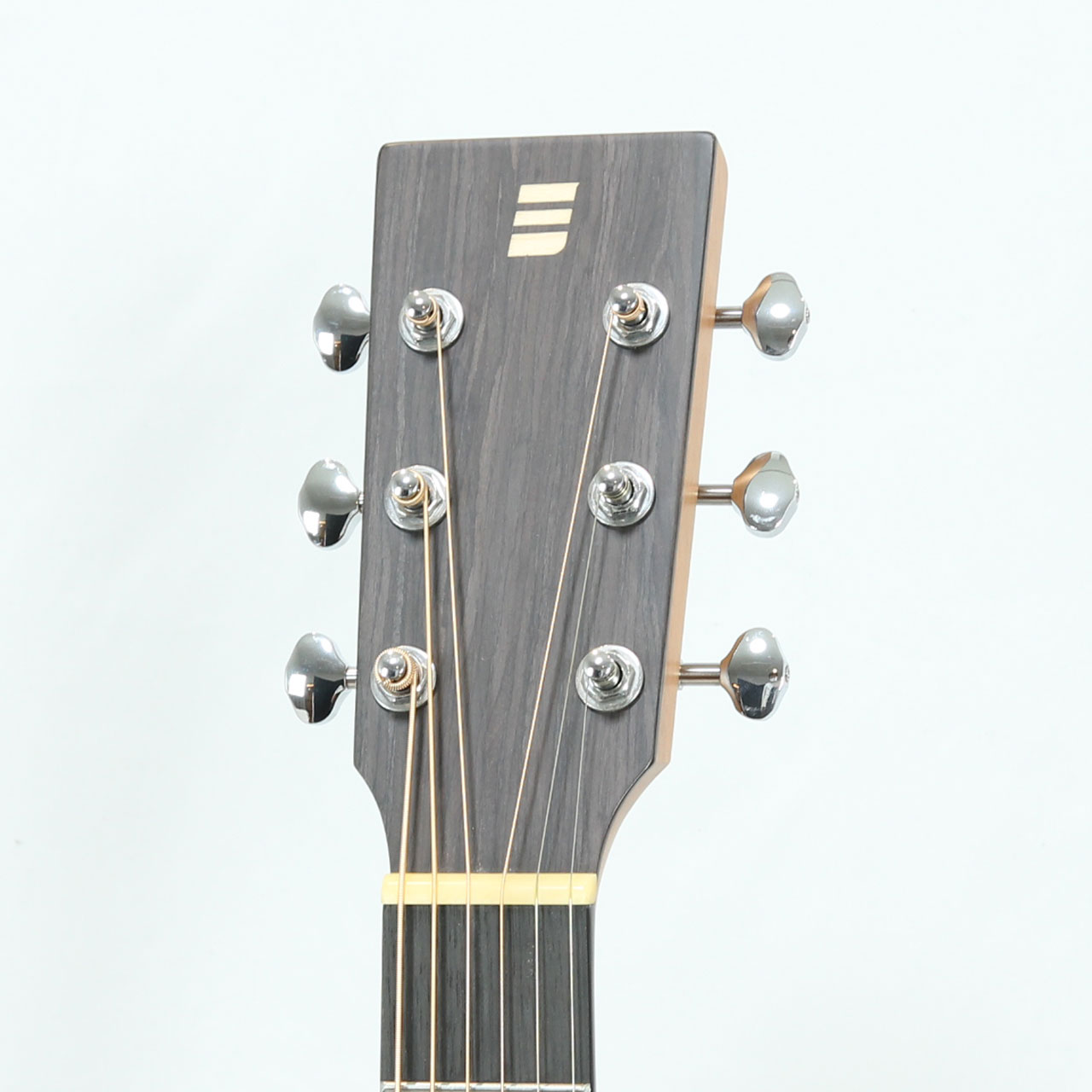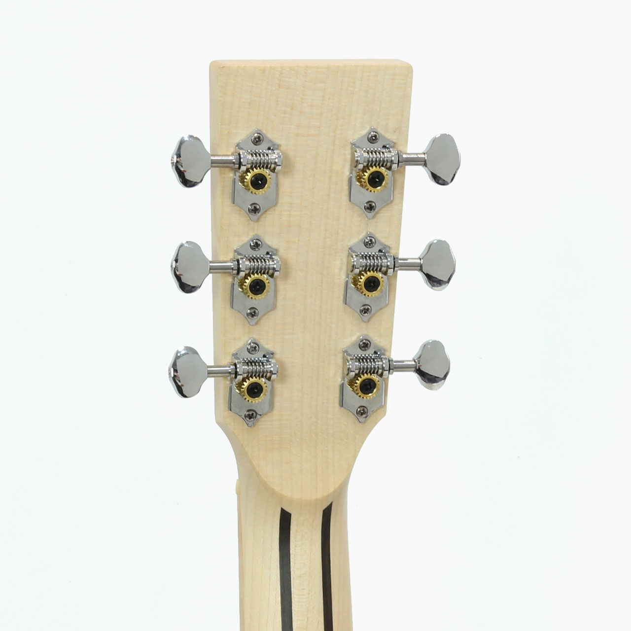 ナット&サドルは高級モデルと同様に牛骨(Bone)をセレクトし、弦の振動をしっかりボディに伝えます。マシンヘッド(糸巻)はオープンギアタイプで玄人好みなヒストリカルで洒落たスペック。ギア部もメッキが施されており、経年変化への対処とチューニングの安定性を向上させています。