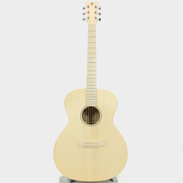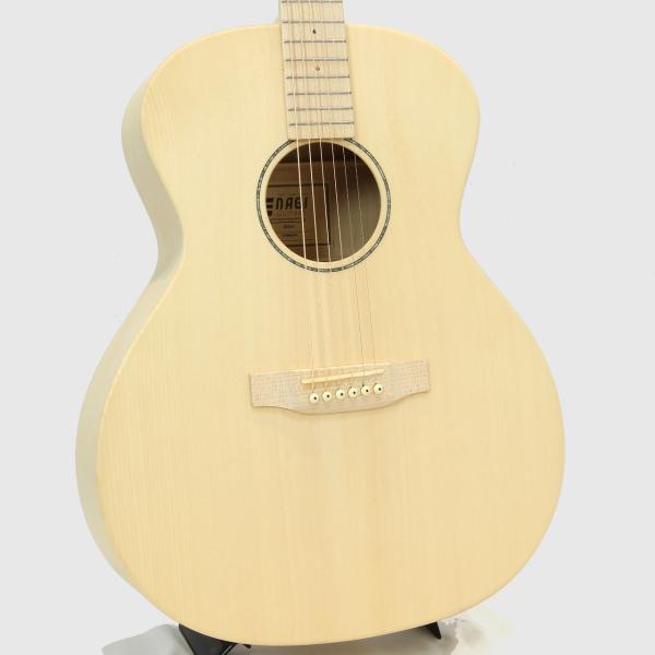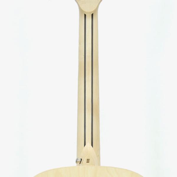 ボディトップ材は高級アコースティックギターのトーンウッドとしても使用されるイングルマン・スプルースの単板を使用。少し黄色味があるのはイングルマンならではの特徴ですが、その中でも白い色味をセレクトして使用しています。サウンド的には一般的に使用されるシトカ・スプルースよりもダイナミックでふくよかなサウンドが特徴的です。ボディサイド&バック材はHPL(ハイプレッシャーラミネイト)で、強い耐候性と剛性を持ち経年変化にも対応し、音響特性でもポジティブな要素として採用しました。表面のデザインとしてフレイムメイプルのテクスチャーをセレクト。
