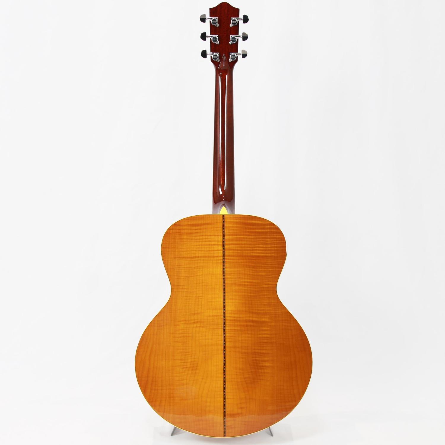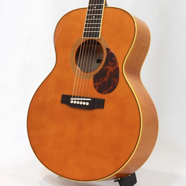 トップ材はAAAグレードのルッツスプルース、サイドバック材はフレイムの美しいメイプルを使用。マホガニー材の1ピースネック、エボニー材ブリッジ&指板、45mmナット幅、630mmスケール、Gotoh SG381ペグのスペック。