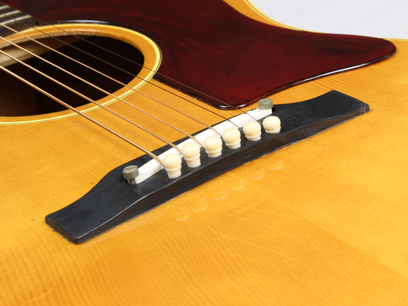 B25は状態がままならない個体も市場に多く、これほど状態も音色も良いコンディションで残っているのも珍しのではないかと思います。Top面には全体的に塗装のチェックが見られますが雰囲気も良く、ノークラックの極上個体です。弦高は6弦2.4mm 1弦1.9mmでネックはストレート、Topの膨らみも問題なく、トラスロッドにもしっかり余裕があります。オリジナルのプラスティックブリッジはセンターと6側はやや浮いておりますが、そもそもボルト留めですので問題ございません。