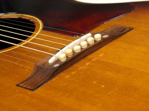 全体的に塗装のチェックや打痕が見られますが雰囲気も良い個体です。ボトム側のセンターシームにはお腹が開いて来ないよう内部からパッチが貼られています。1弦側のサイド板のお尻の膨らみ辺りに元々ジャックを取り付けていただろう痕が有り、現在は穴埋めされております。もともとはハカランダのアジャスタブルサドルですが、こちらは一度埋められており、通常の牛骨によるドロップインタイプのサドルにリプレイスされています。