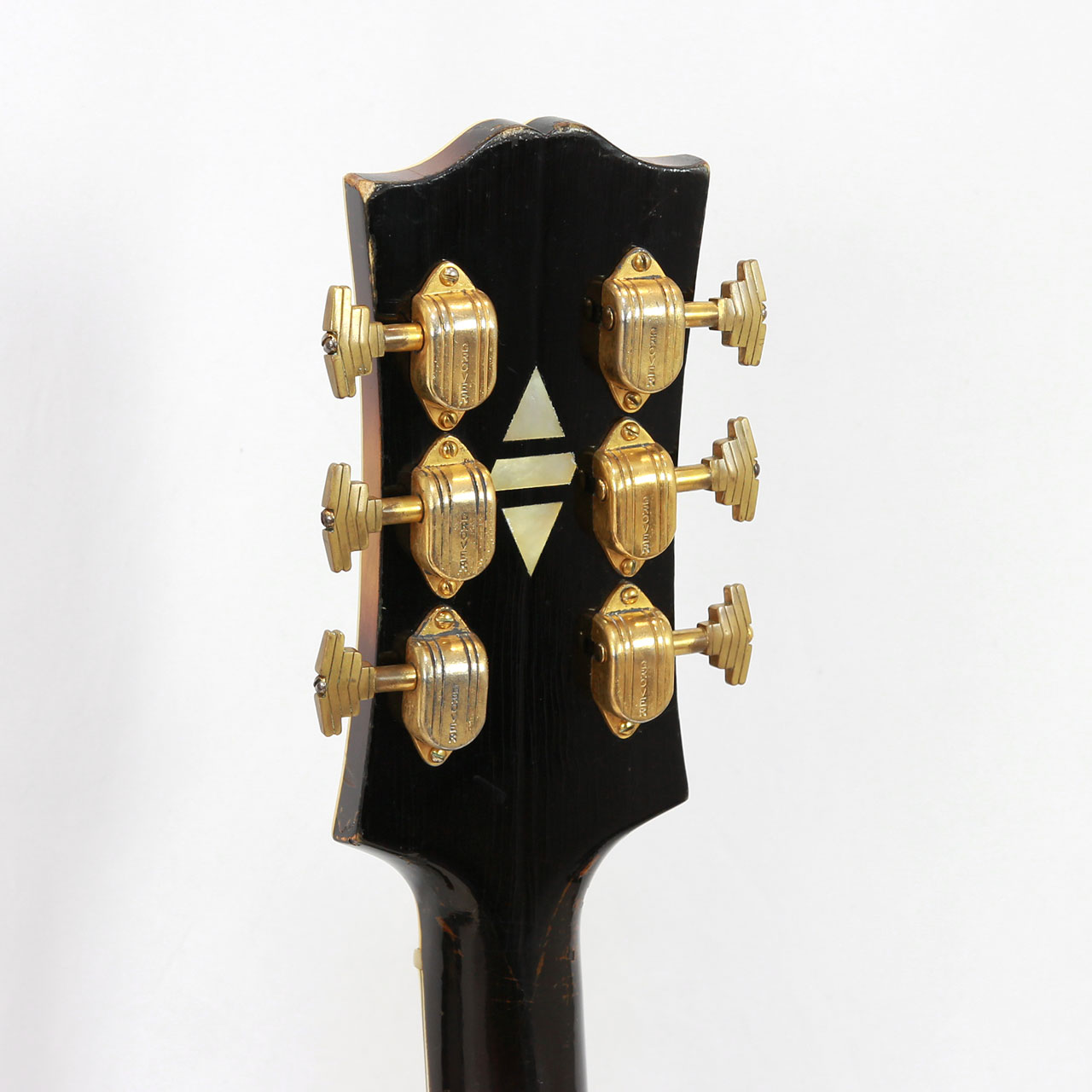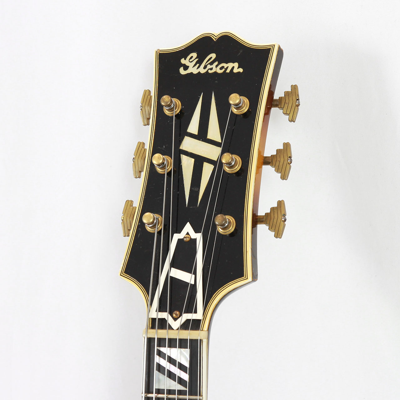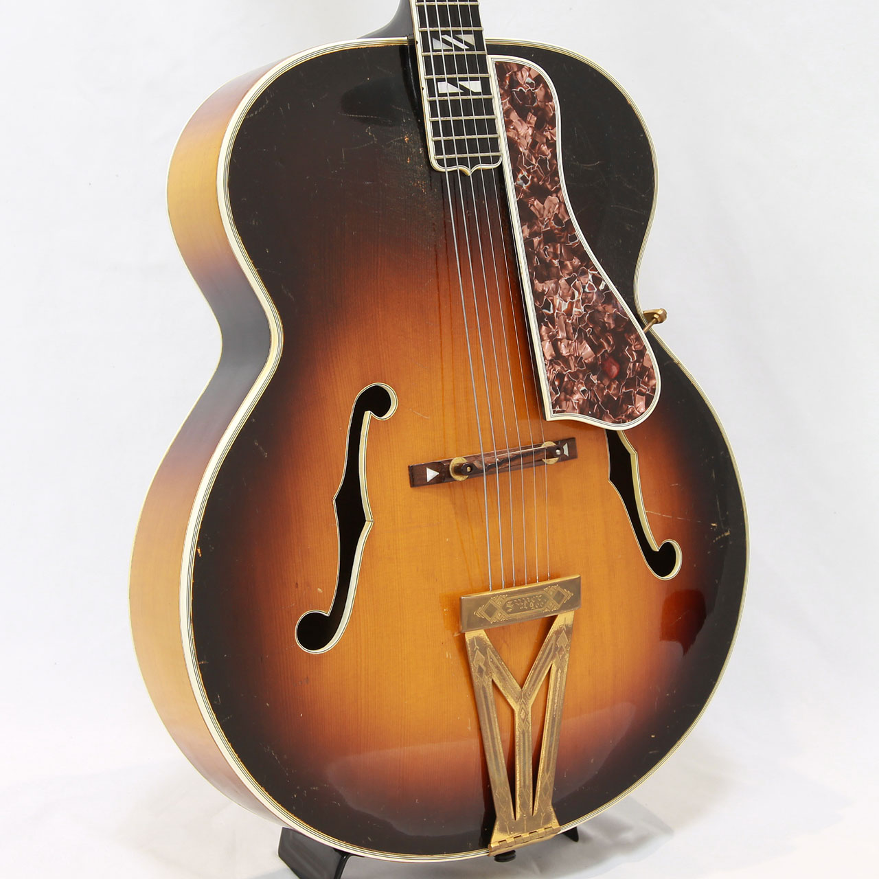 当時の最高機種とあり装飾も非常に豪華。多層バインディングにスプリットダイヤモンドインレイ、テイルピースやピックガードの金具にまで施された彫金は最上位機種に恥じない装いです。