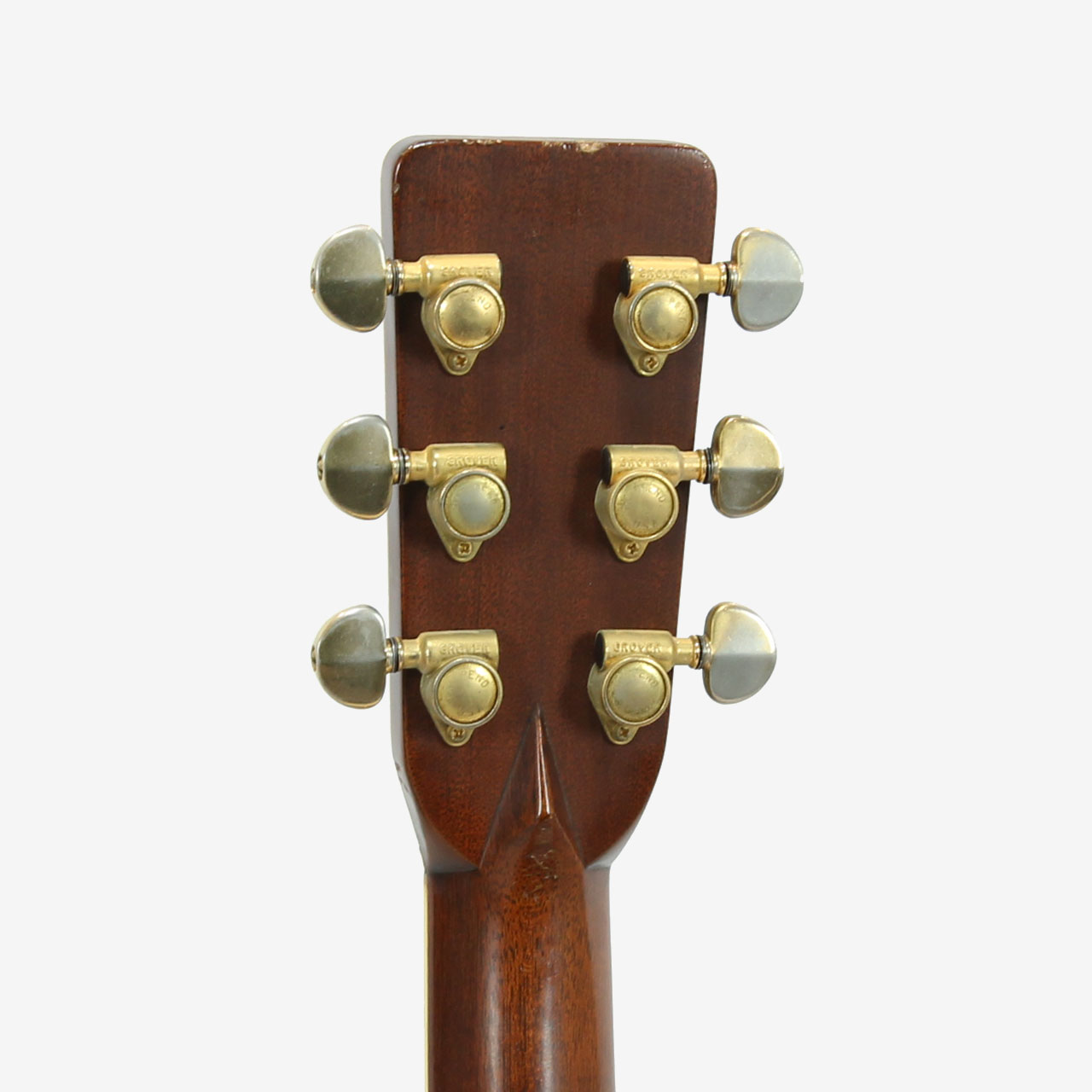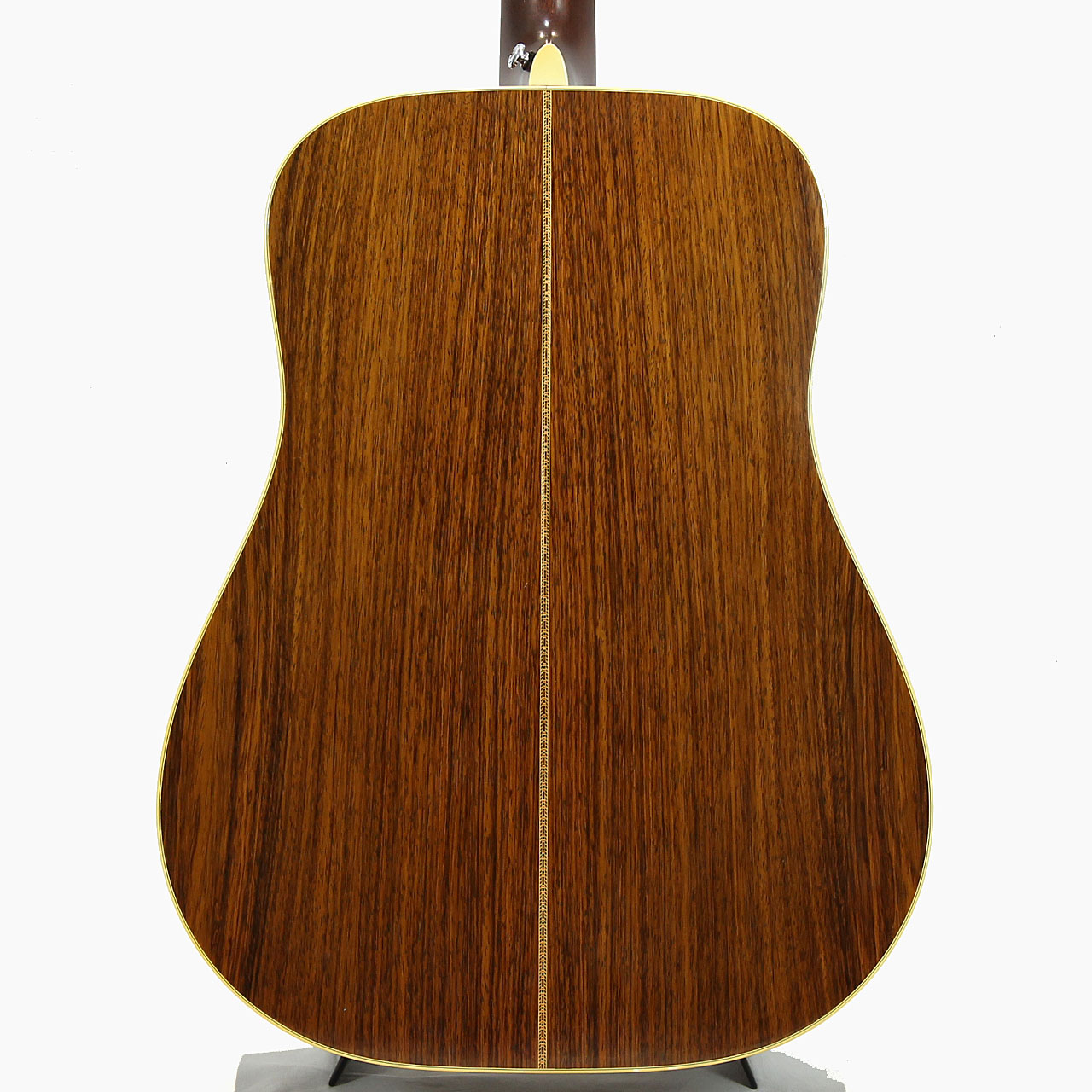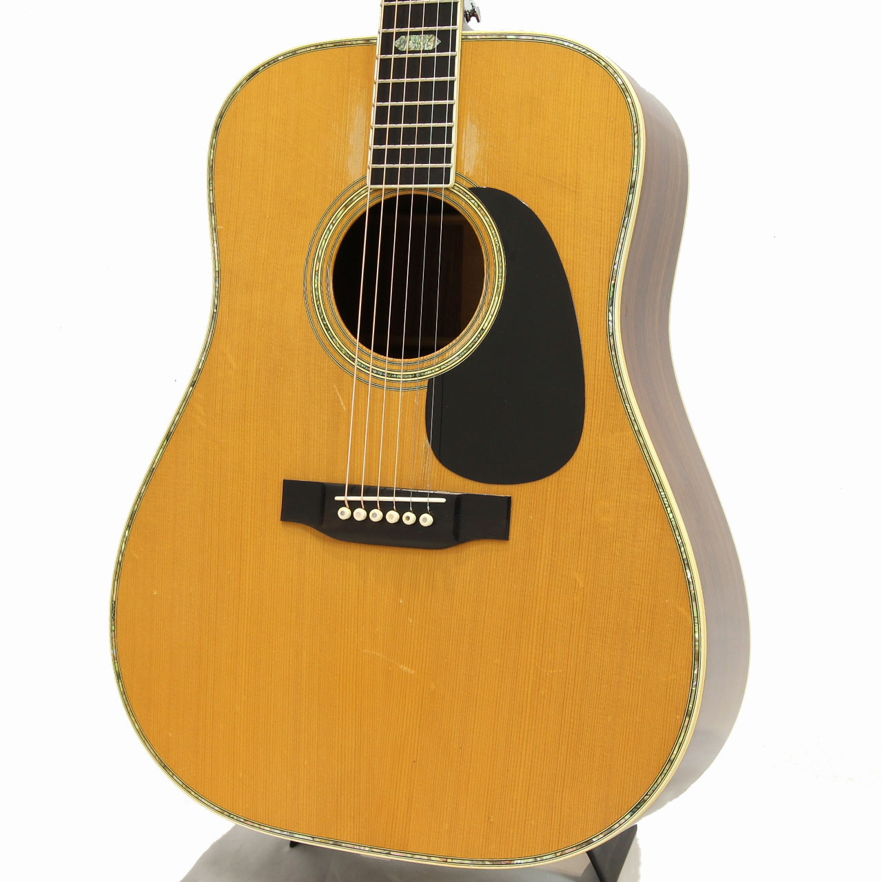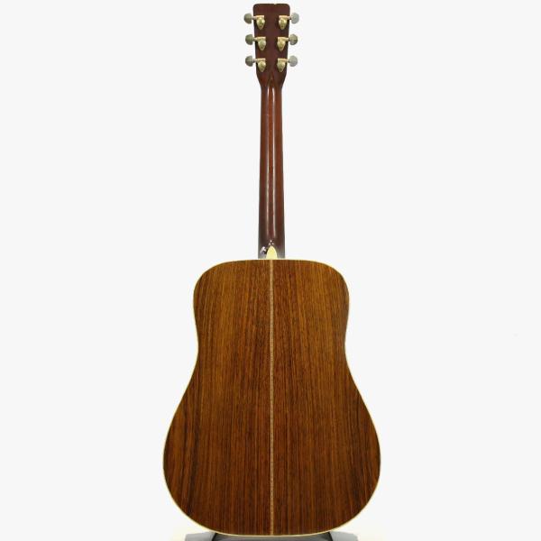 トップ材はジャーマンスプルース、サイド&バック材はインディアンローズウッド、マホガニー材ネック(SQロッド&フルシックネスシェイプ)、エボニー材指板&ブリッジ、オリジナルのGrover 102 ゴールドチューナー、ブラックピックガード(リプレイス済み)、70年代特有の丸みを帯びたヘッドストックにC.F.Martinのバーチカル・ロゴ、スモールヘキサゴン・指板インレイ、ローズウッド材ラージブリッジプレートとなっております。
