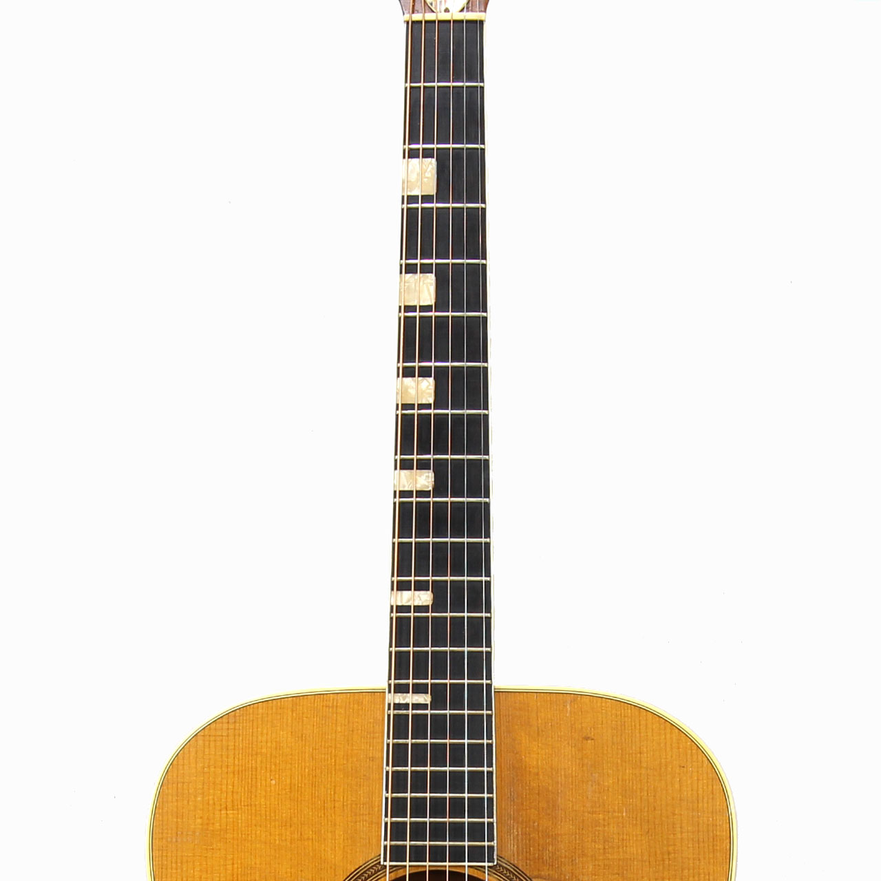 ギター全体に年代相応のウェザーチェックが入っており、ピックガードはオリジナルから交換済み、打痕も相応についているもののクラックやネック折れの履歴はございません。弦高は2.6mm/1.9mmにセッティングしております。ネックはストレートでフレットの残りも8割ほどございます。トラスロッドもまだ余裕はあり調整は可能なもののサドルはほぼ限界まで削られております。
