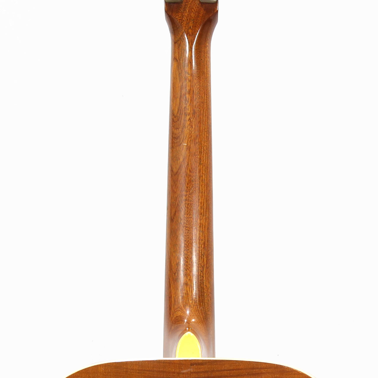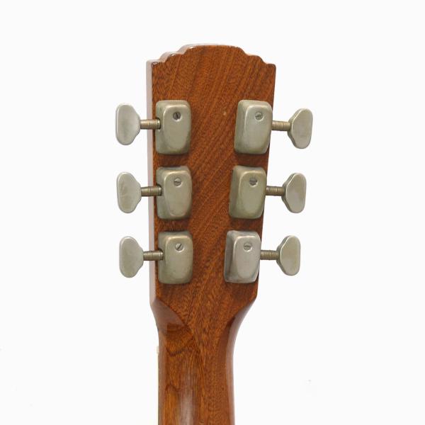 年数の経った明るく乾いたサウンドに630mmの短いスケールによる歯切れのよいアタック感を持ちつつも程よいローエンドも出ており、コードバッキングやフラットピッキングに良く合う雰囲気。大き目のシェイプですが全体的に立ち上がりが早く軽快な鳴りという印象です。ペグはオランダのVan Gent製、グレッチやヘフナーのヴィンテージにも付いていることのあるメーカーで、見慣れない形状ながら滑らかで良好なトルク感です。