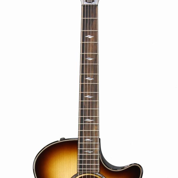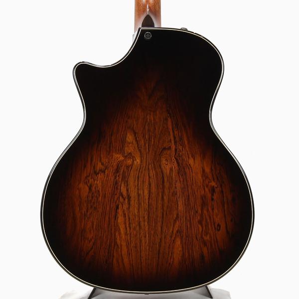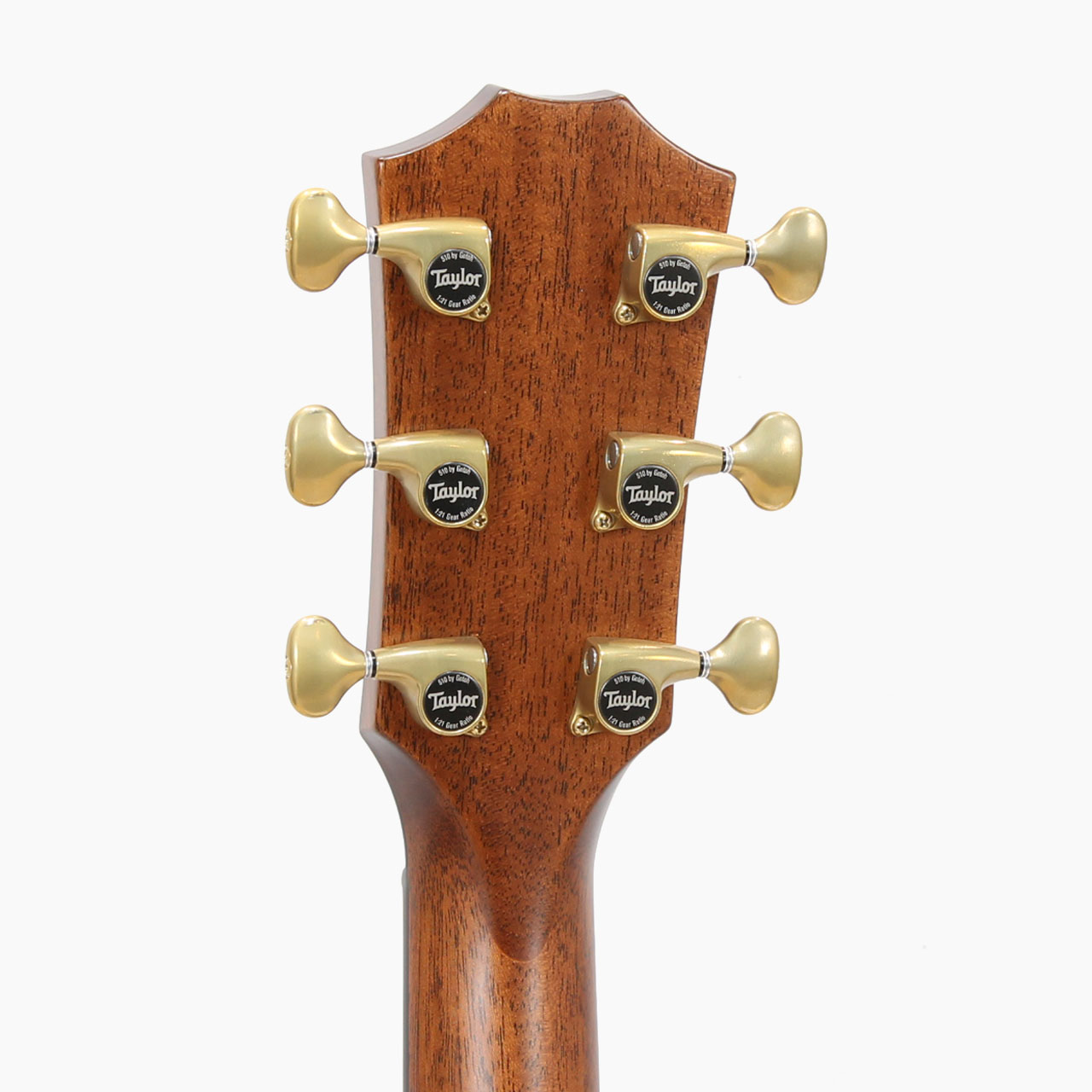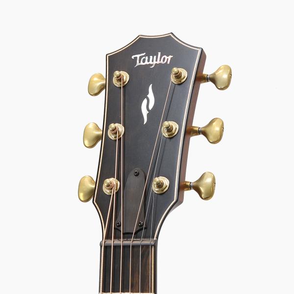 トップ材にはアディロンダックスプルース、サイドバック材はホンジュラスローズウッドの組み合わせ。ホンジュラスローズウッド材はローズ種の中でも比重が大きく、その質量と硬めのサウンド特性により広レンジで大迫力の音像が魅力。アディロンダックスプルースの厚みのあるトルクフルな出力感と相まって、非常に豊かな生音です。テイラーギターはややすっきりとしたモダンなサウンドが特徴の一つですが、こちらのギターはどっぷりとした豊かなローエンドと抜けが良く基音がハッキリとしたプレーン弦の響きを持っており、生鳴りだけでも十二分に楽しんで頂ける最高峰のギターに仕上がっております。