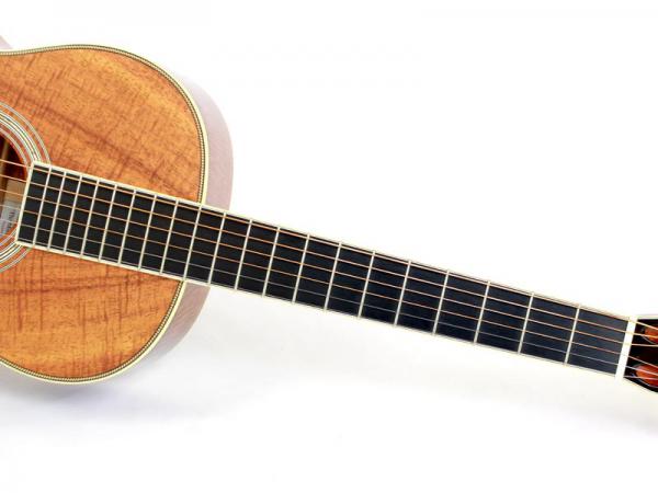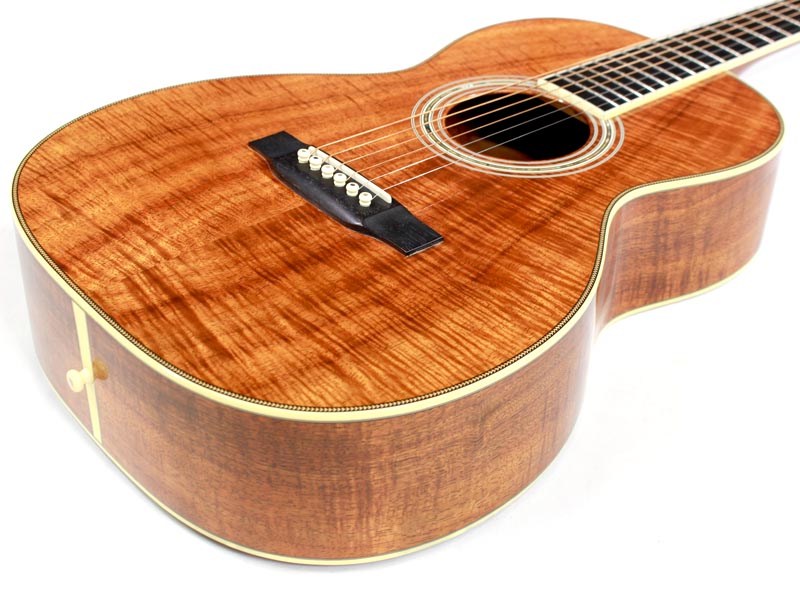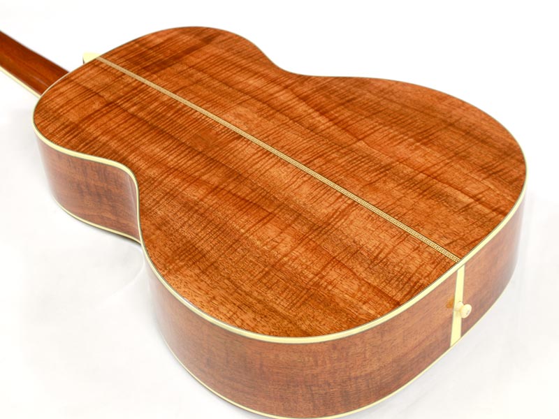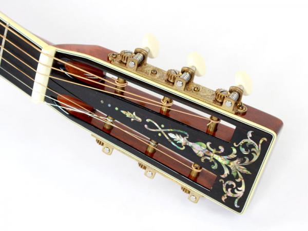 トップ、サイド&バックは見事なフィギュアードコア材が使用されており、この年代のマーチン社の木材ストックが非常に豊富だった事が伺えます。ブリッジと指板はエボニーを使用。指板にはポジションマークが施されておりませんが、サイドポジションはアバロンでポジションマークが入れられております。天神にはマーチン社で最も豪華なオルタネイティヴ・トーチインレイが施され、バインディングはアイボロイド、ボディにはヘリンボーンが施されています。