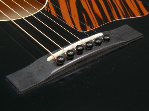 スプルース材単板トップ、フレイムメイプル材単板サイド&バック、マホガニーネック、ローズウッド指板、エボニー材ストレートブリッジ、ヴィンテージ X ブレーシング、12Fジョイント、セミグロス・ニトロセルラッカー、Golden Age Restoration Tunerと、持ったフィーリングからルックスまで、その全てが見事にヴィンテージ感に溢れています。
