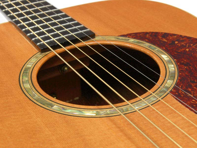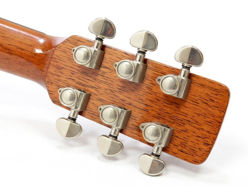 トップ材はスプルースの単板、サイド&バック材はローズウッドの単板で、ハードウッド材ネック、エボニー材指板&ブリッジ、アヴァロン・ゼッタ、43mmナット幅、647.7mmスケール、Groverペグとシンプルで端正な顔立ち良いモデルです。