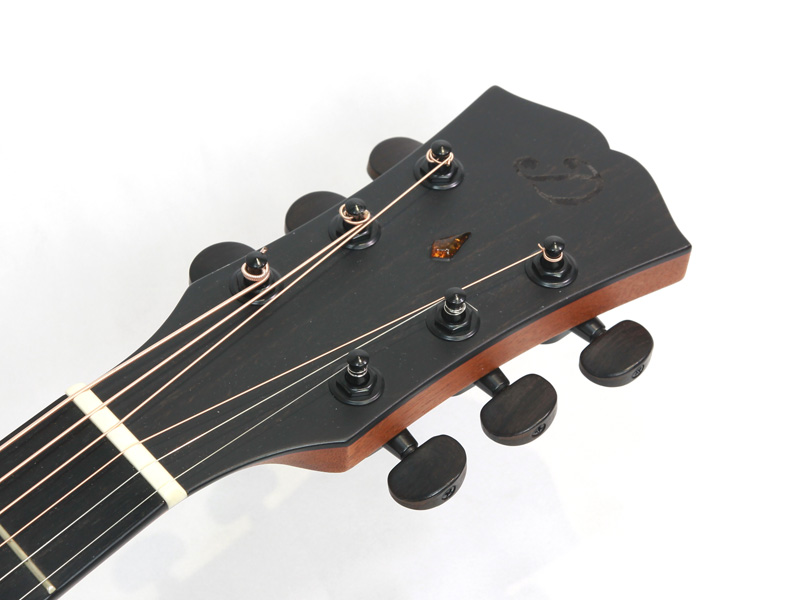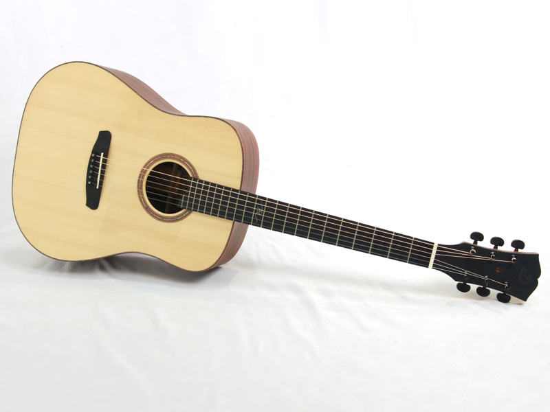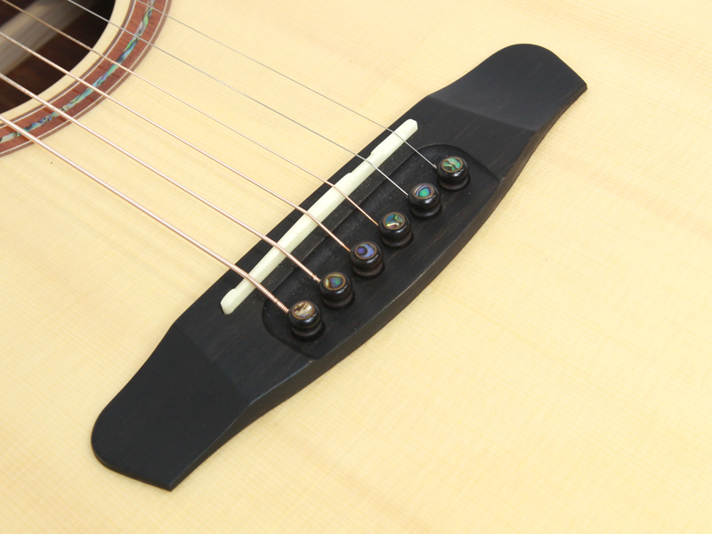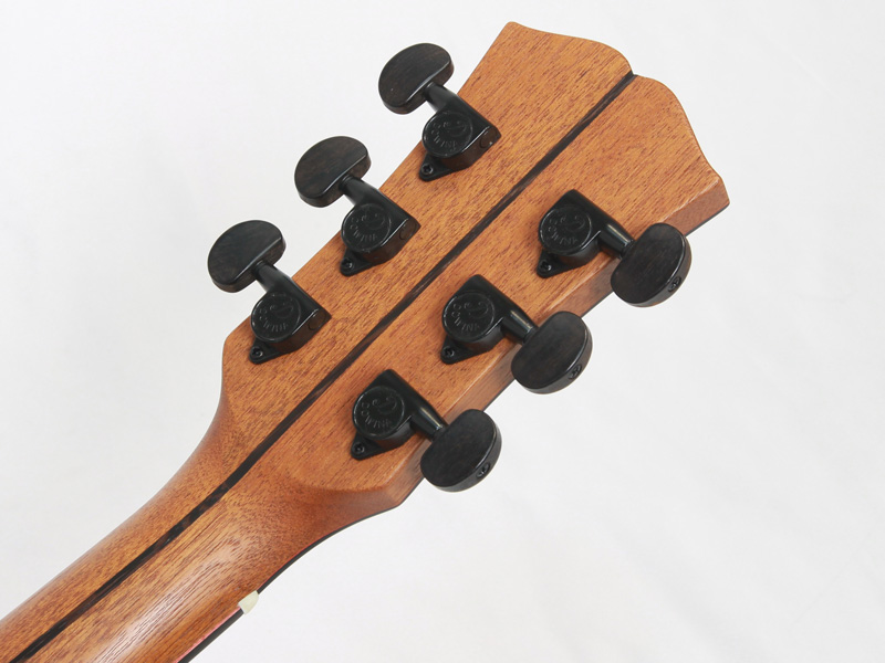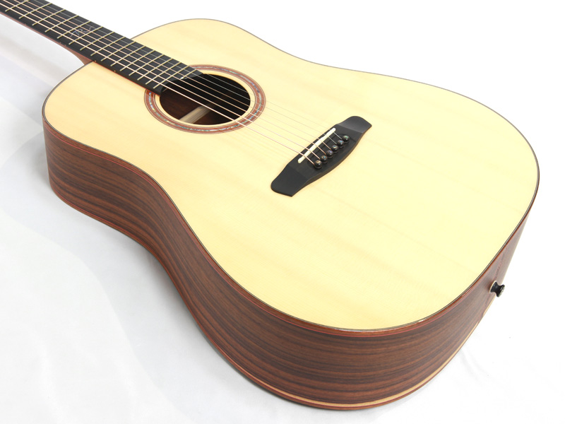 こちらの機種はドロミテスプルース材単板トップ、インディアンローズウッド材単板とフレイムメイプル材単板の3ピースサイド&バック、マホガニー材ネック、エボニー材指板&ブリッジ、45mmナット幅、650mmスケール、クリアピックガード、牛骨ナット&サドルと、非常に本格的なスペックとなっております。