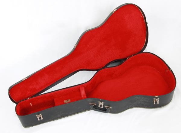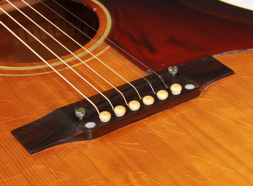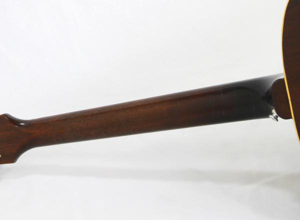 当店入荷時にAnthemピックアップが取り付けられており、コンバージョンサドルへと変更されていたものを、ピックアップの取り外しと付属されていたオリジナルのウッドサドルへと戻しております。エンドピンのジャック穴は12mmのコンバージョンエンドピンにて対応しています。ネックアングルは良好で、12F上で6弦側が約2.5mm、1弦側が約1.9mmでセットアップしており、演奏性は抜群です。バック面の6弦側くびれから内側に約4cm程の場所に縦に約17cm程のクラック修理歴あり。ネックヒール部にはストラップピンが打たれております。サイド両肩とネックのヒール回りの塗装が割れて剝がれていたために塗装のやり直しを行っています。その他、ストラップピン穴補正済み。