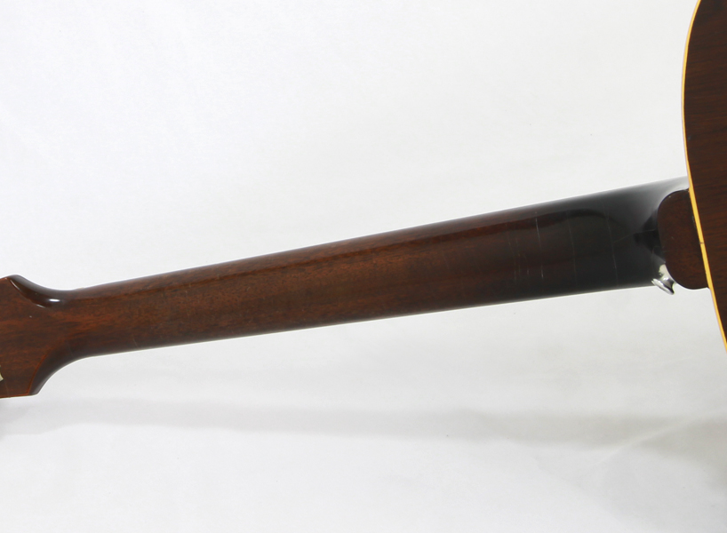 ウェザーチェックが全面に入っており、非常に貫禄のある1本。ナローネックに14度ヘッド角の作りだから可能なストロークやカッティングでのプレイ時に得られる歯切れの良い抜群のアタック音は、この年代のJ45特有の唯一無二なものだと思います。