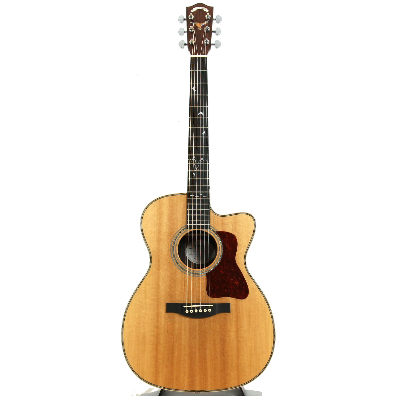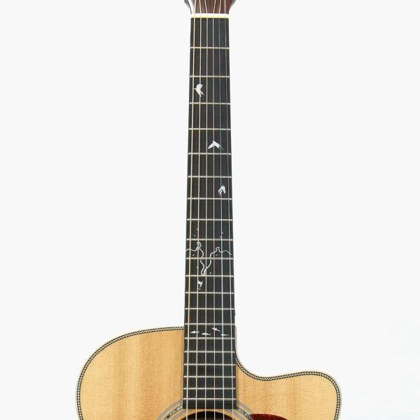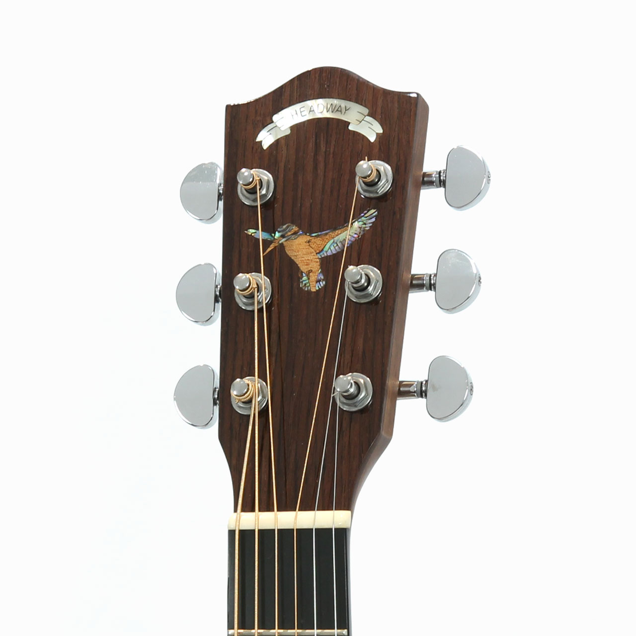 さまざまなボディシェイプやトーンウッドの組み合わせを試し、その中でわたなべゆうの得意とする演奏スタイルである温もりと透明感を併せ持つフィンガースタイルに最もフィットする仕様を選択。デザイン面では往年の愛機であるHeadway HDC-1020 “King Fisher”のデザインを落とし込みユニークなインレイデザインで指板やヘッドを装飾しています。