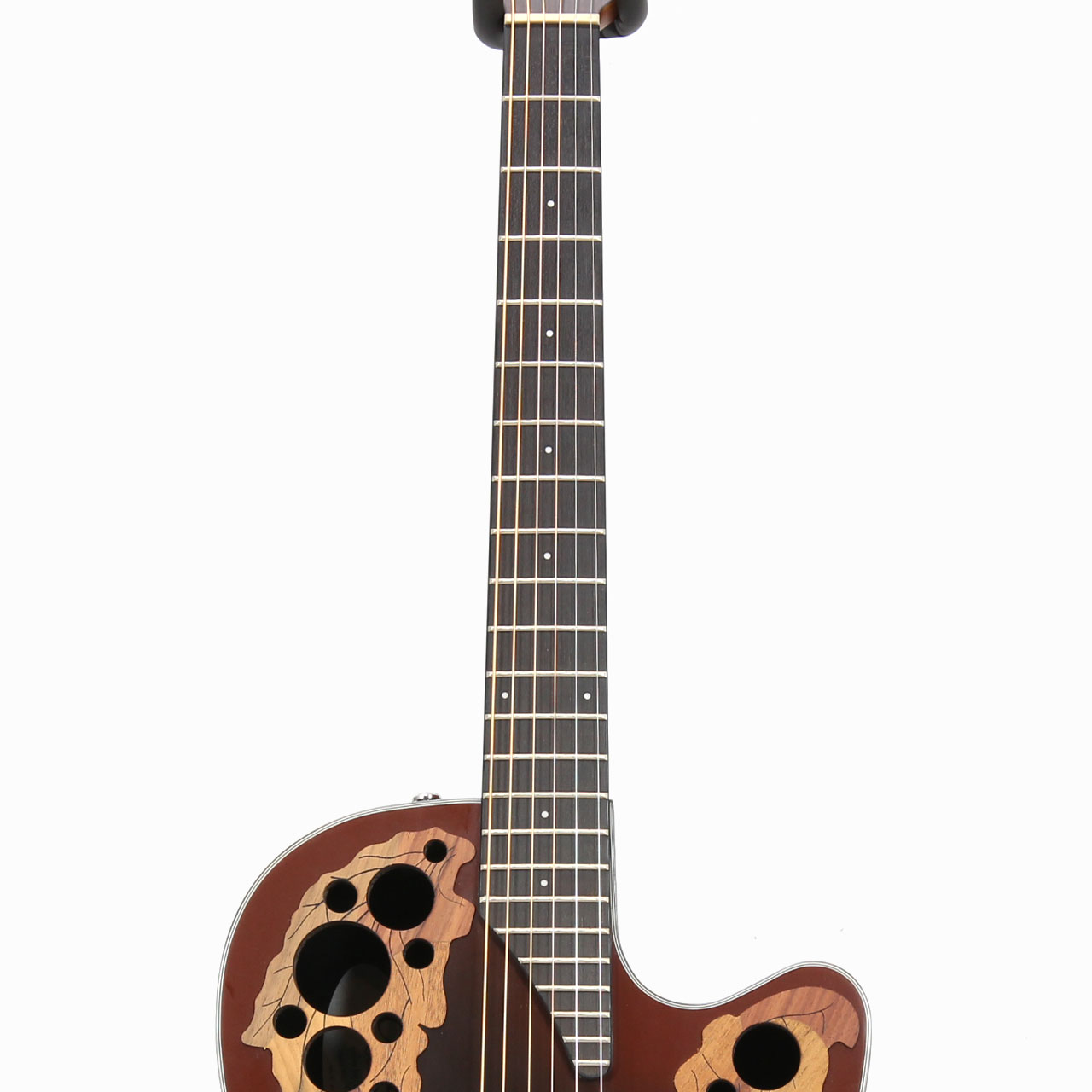 リラコード・ボディの仕様、ミッドディプスボディは生音でも豊かな音量を奏でます。オベーションならではのグリップ感はエレキからの持ち替えもスムースです。