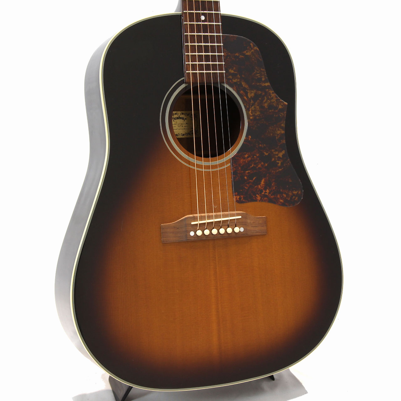 スペックは、イングルマンスプルース材単板トップ、マホガニー材単板サイド&バック、マホガニー材ネック、ローズウッド材指板&ブリッジ、ラージピックガード、Gotoh製ペグ。