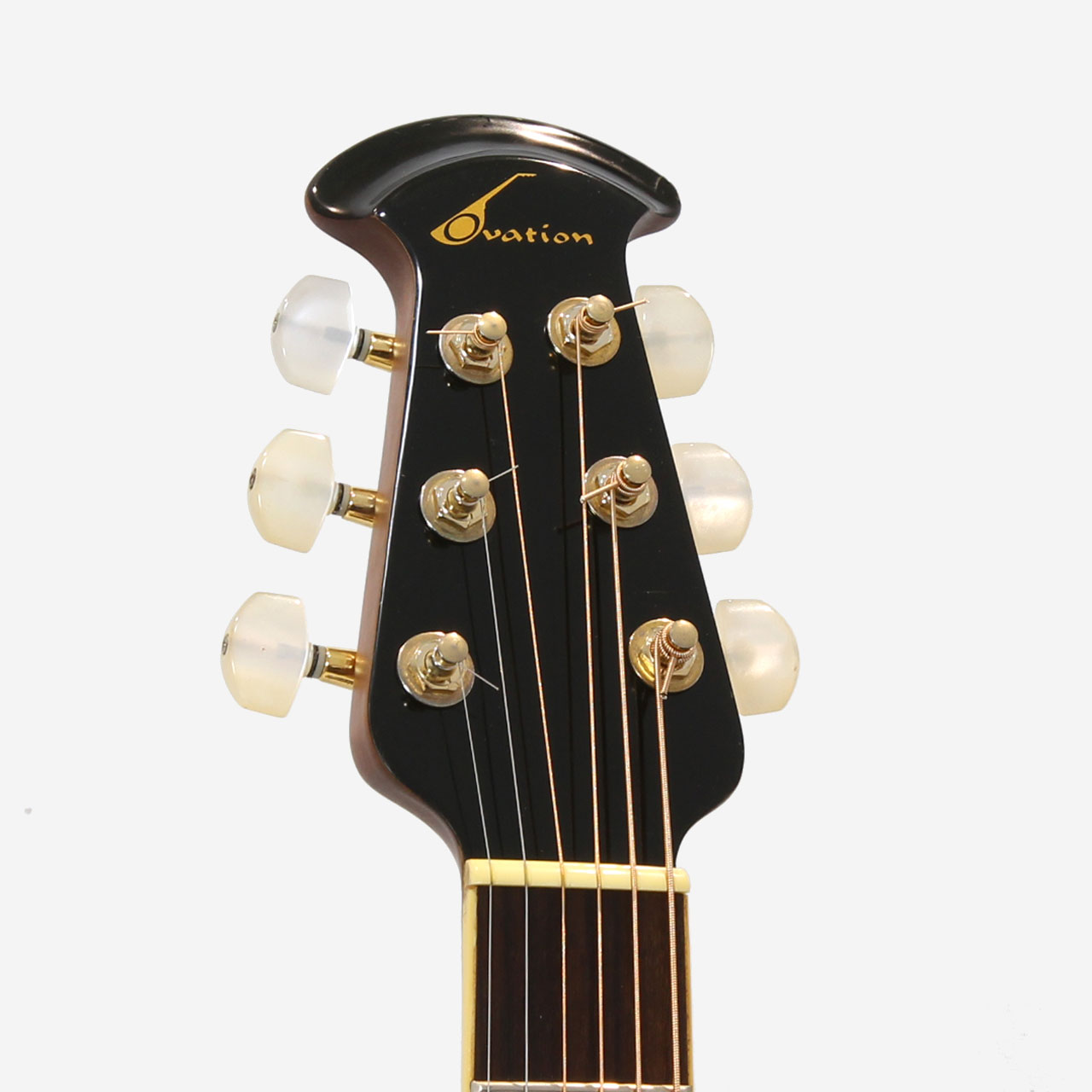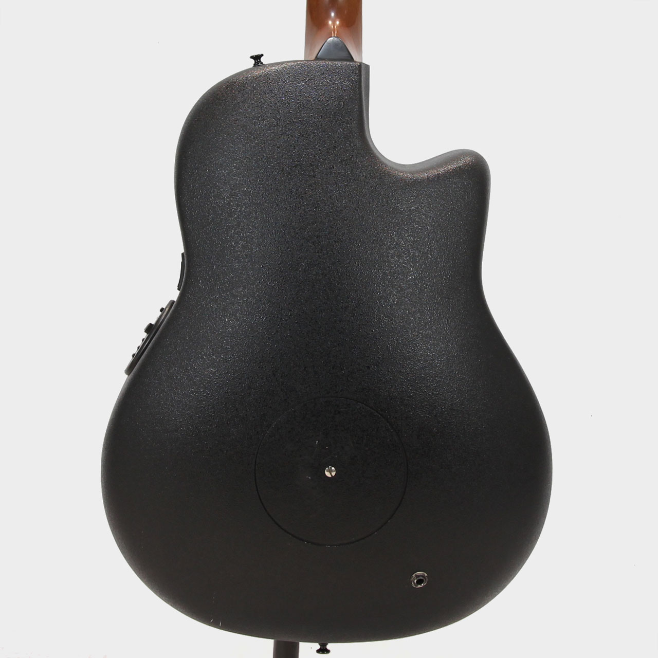 スプルース材トップにリラコード材サイド&バックのディープボディ・シェイプの組み合わせとなっており、マホガニーネック、ローズウッド材指板&ブリッジ、オベーションロゴペグのスペックです。