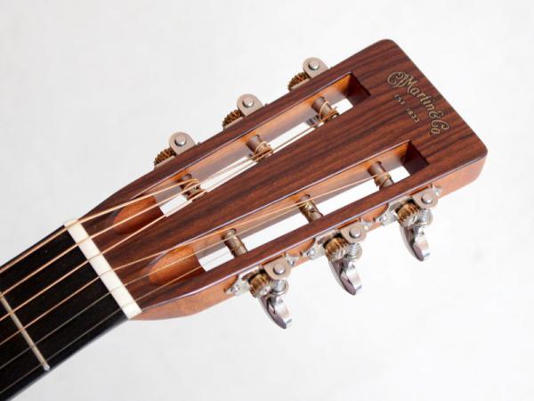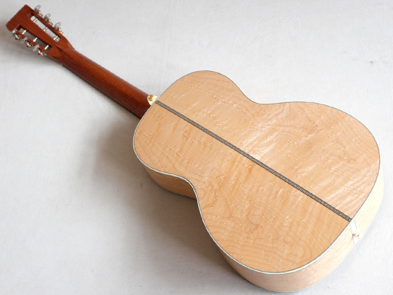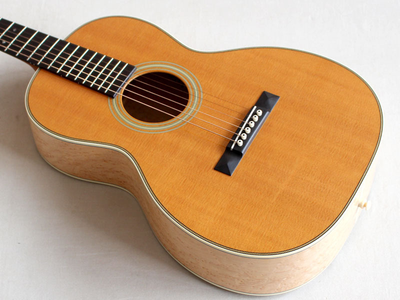 シトカスプルース材トップ、バーズアイメイプル材サイド&バック、マホガニー材ネック(Modified V)、エボニー材指板&ブリッジ、Wavely製ペグ、ヘリンボーントリム、ジグザグ・バックストリップ、ピラミッドブリッジ(ロングサドル)、アイボロイド・バインディング、ダイアモンド&スクエア(ショート)指板インレイ、632.5mmスケール、47.6mmナット幅と、ヴィンテージ仕様の極上コンパクトスタイルとなっております。