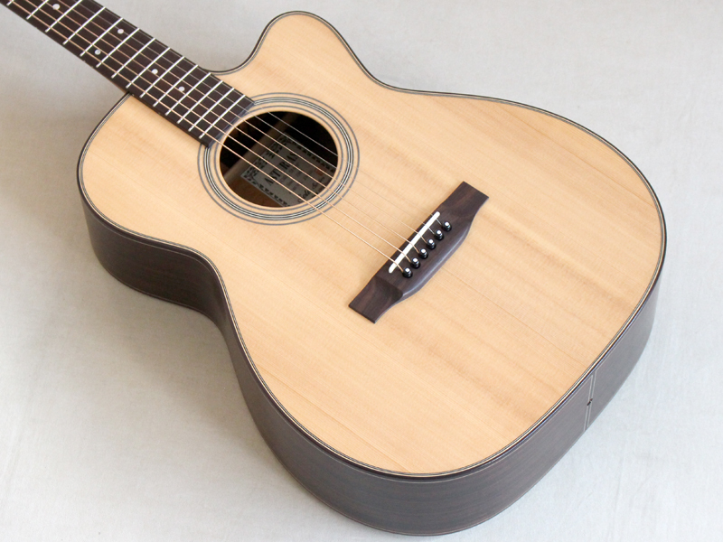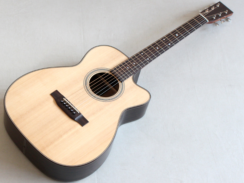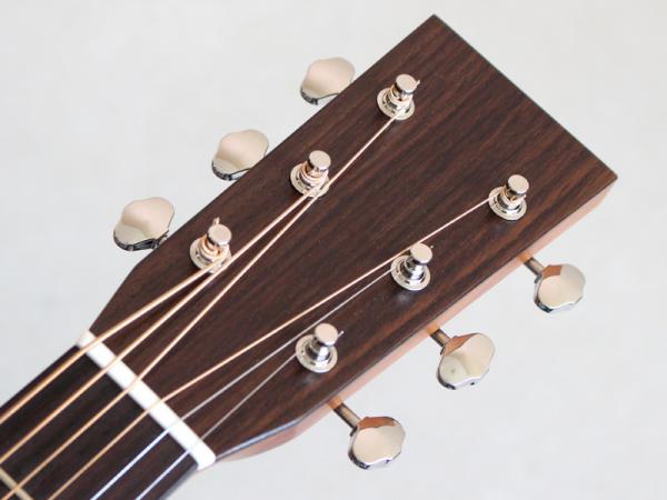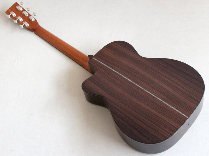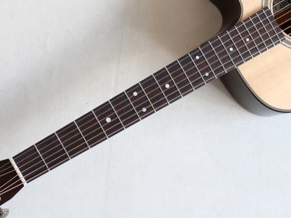 スペックはTOP板シトカスプルース単板、SIDE&BACKインディアンローズウッド、マホガニー材ネック、インドローズ指板&ブリッジ、43mmナット幅、約645mmスケール、ウレタンサテンフィニッシュ仕上げ。