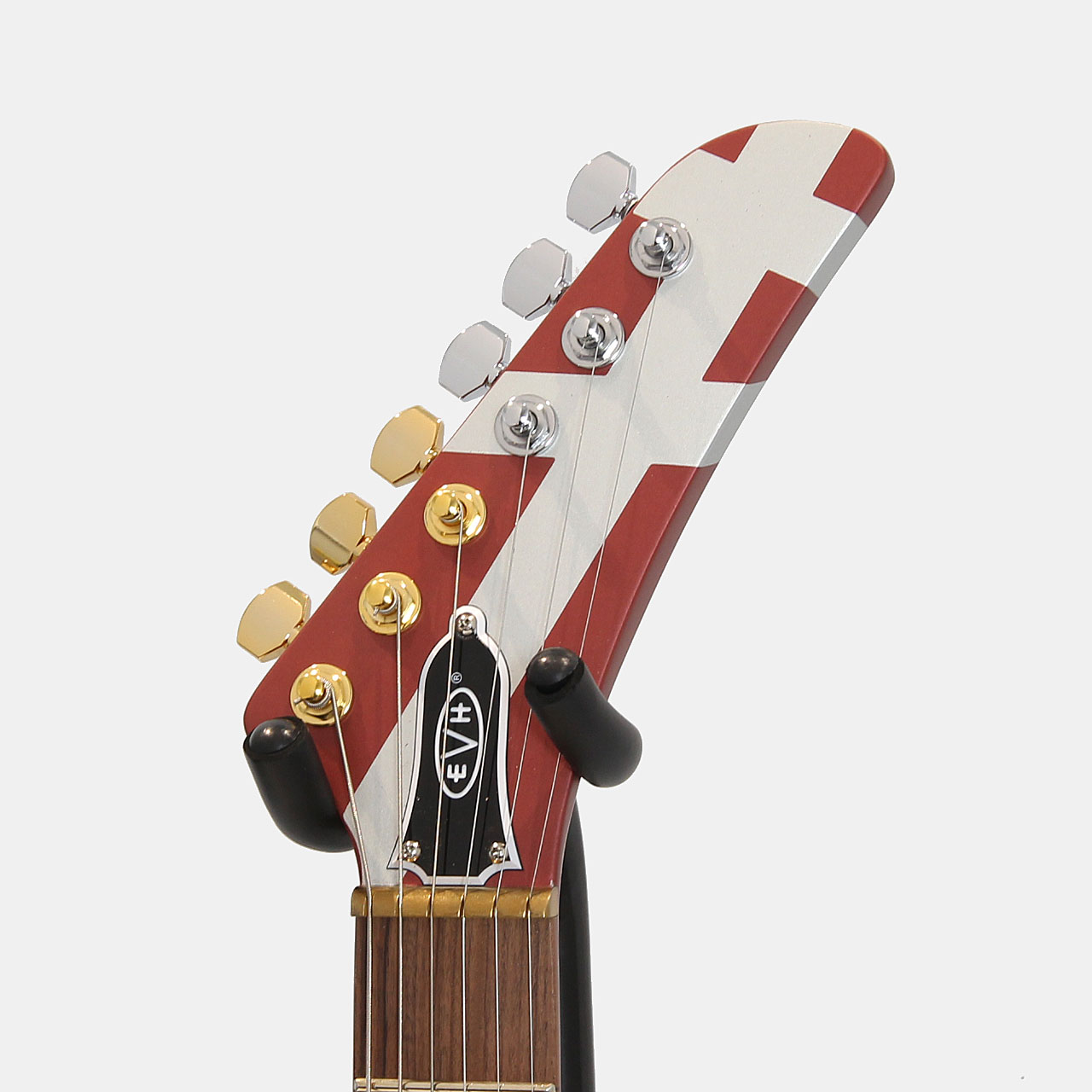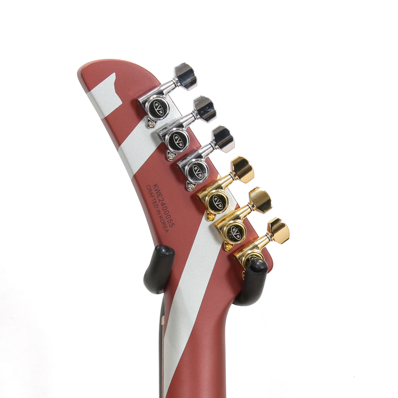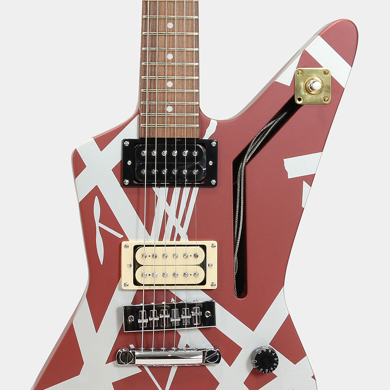 Burgundyカラーに際立つシルバーストライプに加え、ブラックのナンバー入りノブ、ブラスマウントプレートに格納された3連トグルスイッチ、ブラスナット、ゴールドとクロームのEVH刻印入りGotoh®カスタムチューナー、ターンバックル付きクロムアイフックなど、人目を惹く特徴を備えています。