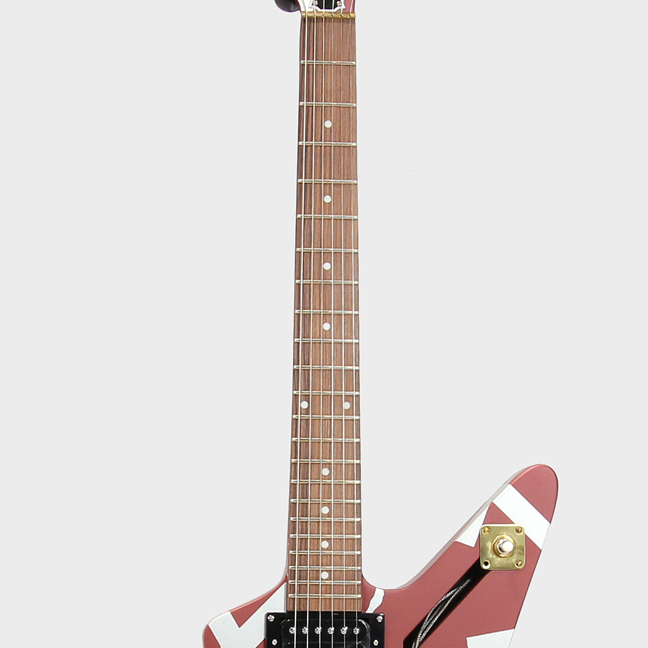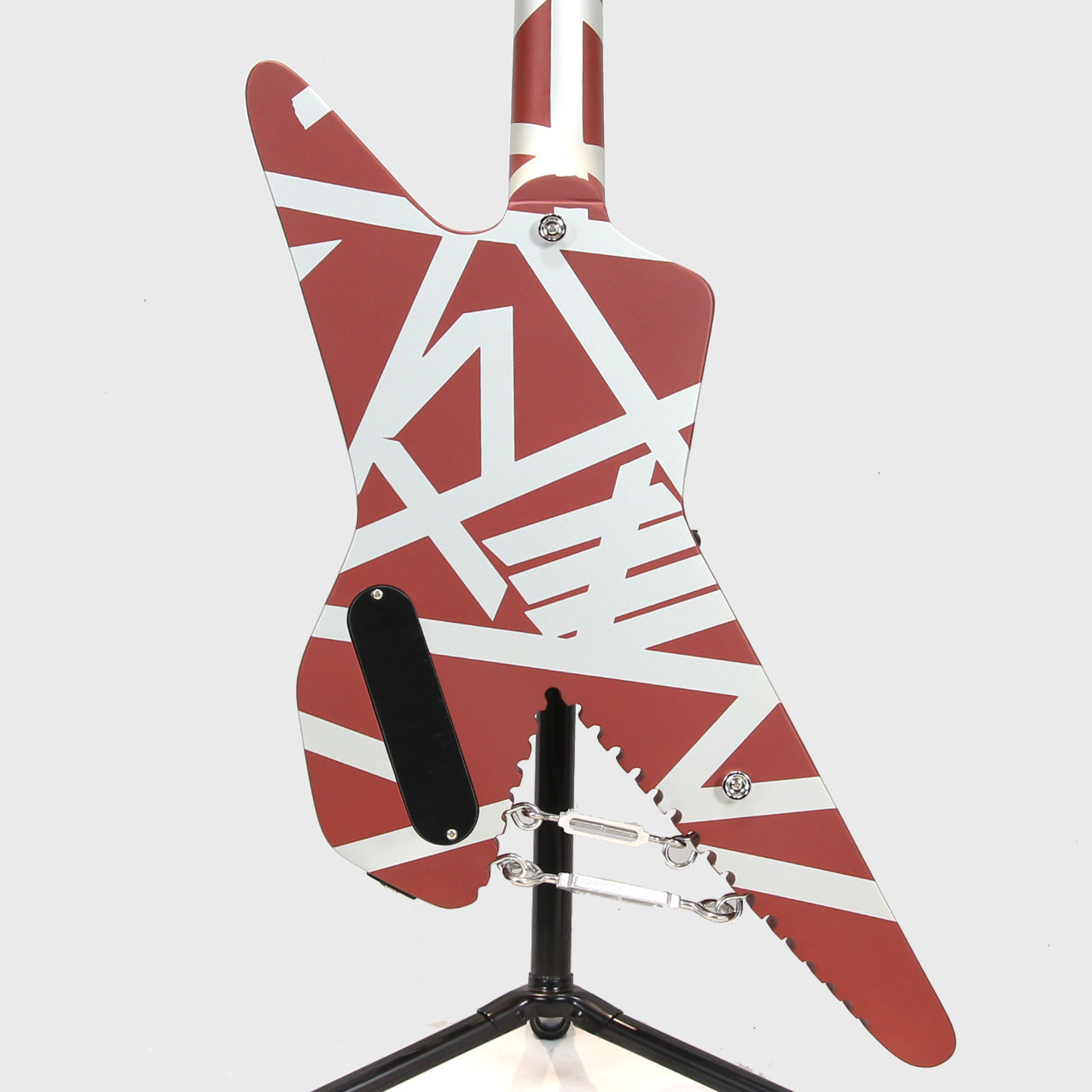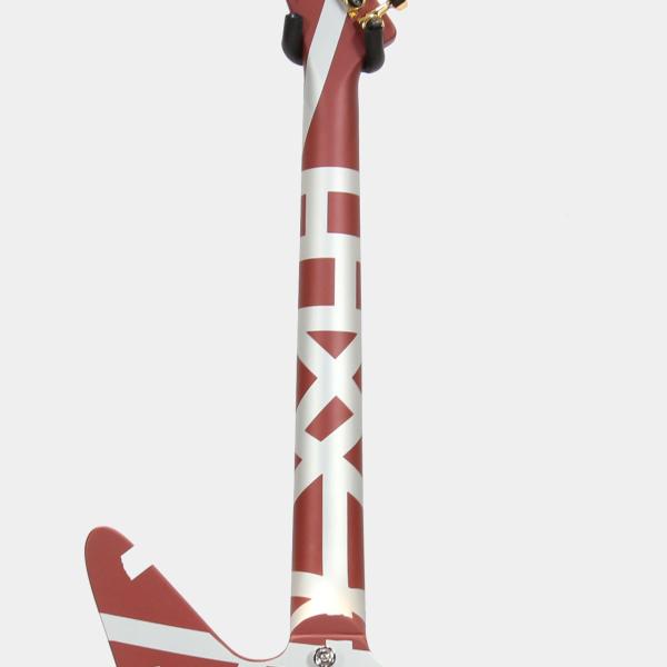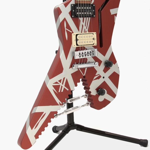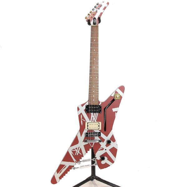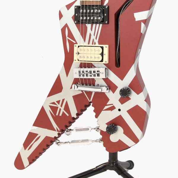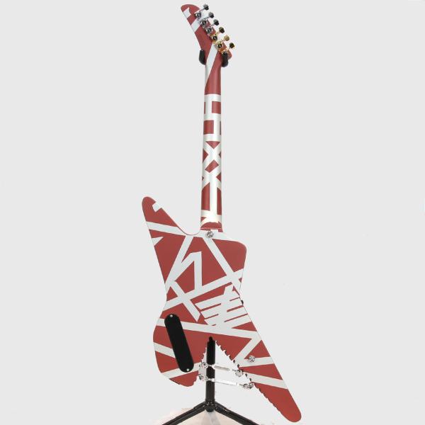 エディの演奏といえばタッピング、というように、それらのギターが、ヴァン・ヘイレンのサウンドを象徴するものとなりました。「シャーク」と名付けられたこのギターは、角張ったオフセットギターボディの一部を削り、歯のようなギザギザのエッジを残したデザインが特徴です。銀色の塗料を塗った後、エディは有名なストライプパターンのテープを貼り付け、最後にバーガンディーカラーのSchwinn自転車用塗料を吹き付けて完成させました。最終形は1978年の初のVan Halenワールドツアーでお披露目され、1980年のVan Halenのアルバム『Women and Children First』のバックカバーに登場したことで、より広く知られるようになり、ファンに慕われるようになりました。