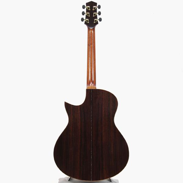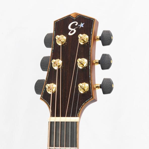 スペックですが、トップ材はAAAグレードのスイス"ムーン"スプルース、サイド&バック材もまたAAAグレードのインディアンローズウッドを使用。アフリカンマホガニー材とローズウッド材による5Pネック、エボニー材指板&ブリッジ、アヴァロンロゼッタ、コア材バインディング、埋め込み式ローズウッド材ピックガード、Starsunオリジナル・チューナー、44mmナット幅、648mmスケール、エボニー材ブリッジピン、Camel Bone材ナット&サドル、極薄グロス・ポリウレタンラッカーフィニッシュの仕様となっております。