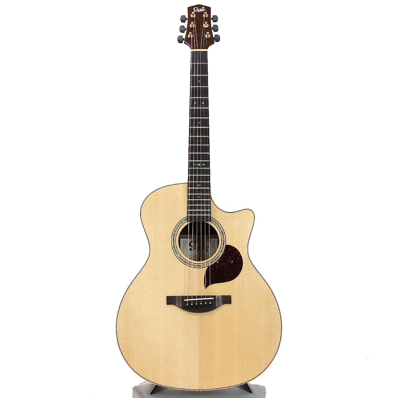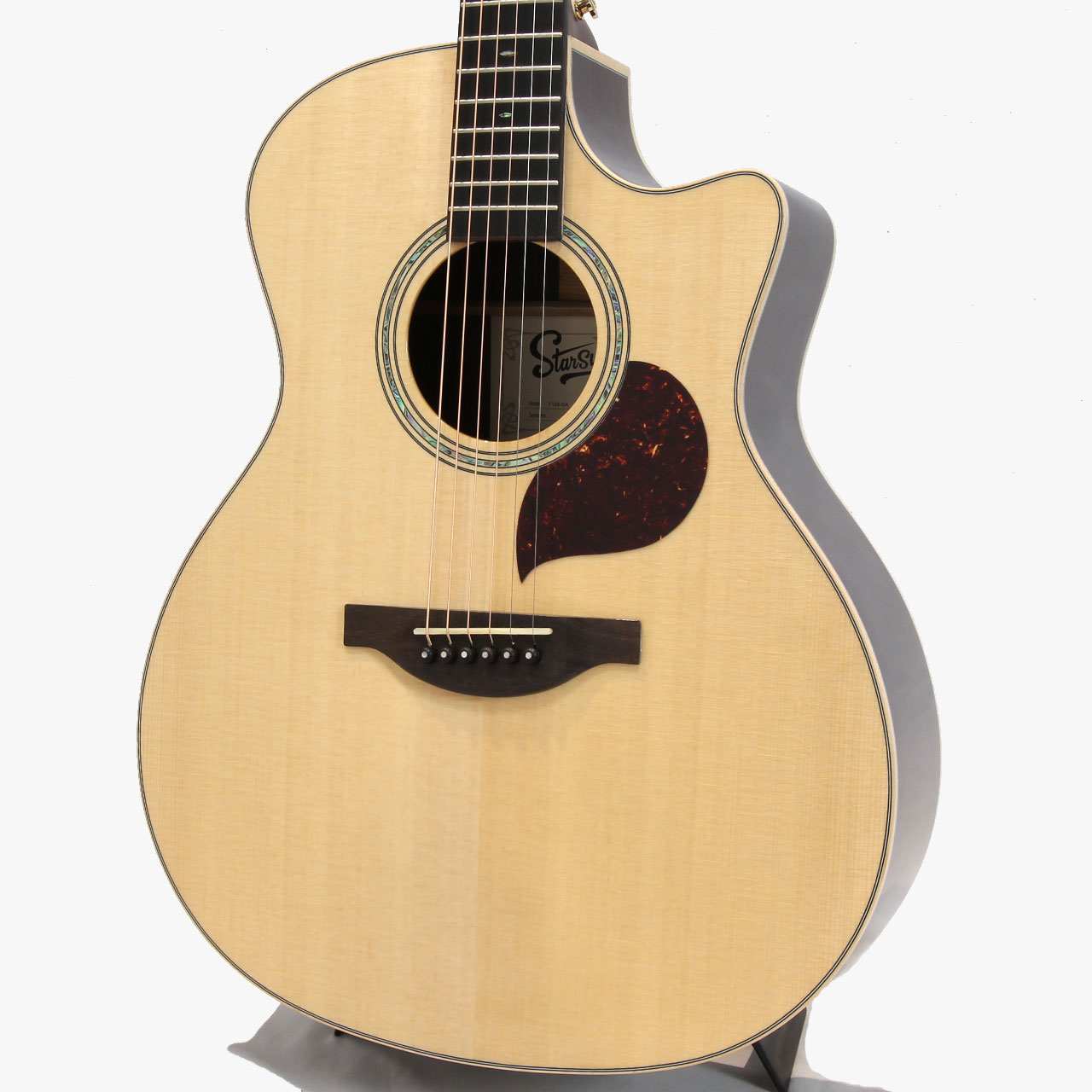 トップ材はシトカ・スプルース、サイド&バック材はインディアン・ローズウッドを使用。アフリカンマホガニーネック、エボニー材指板&ブリッジ、アヴァロンロゼッタ、メイプル材バインディング、Starsunオリジナル・チューナー、44mmナット幅、648mmスケール、エボニー材ブリッジピン、Camel Bone材ナット&サドル、極薄グロス・ポリウレタンラッカーフィニッシュの仕様となっております。