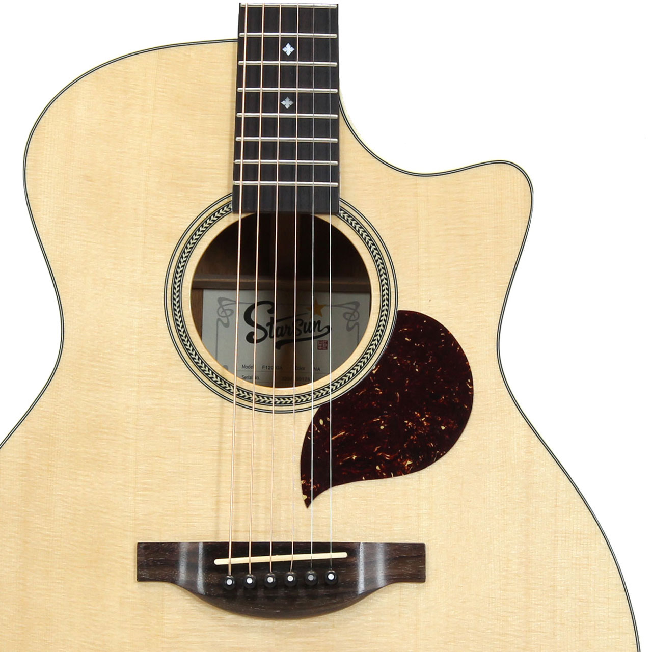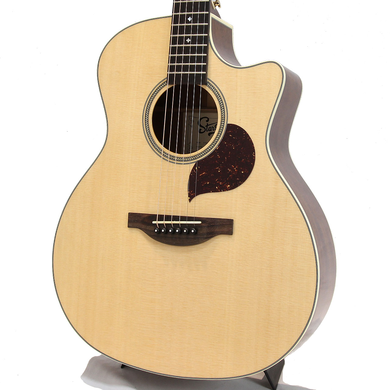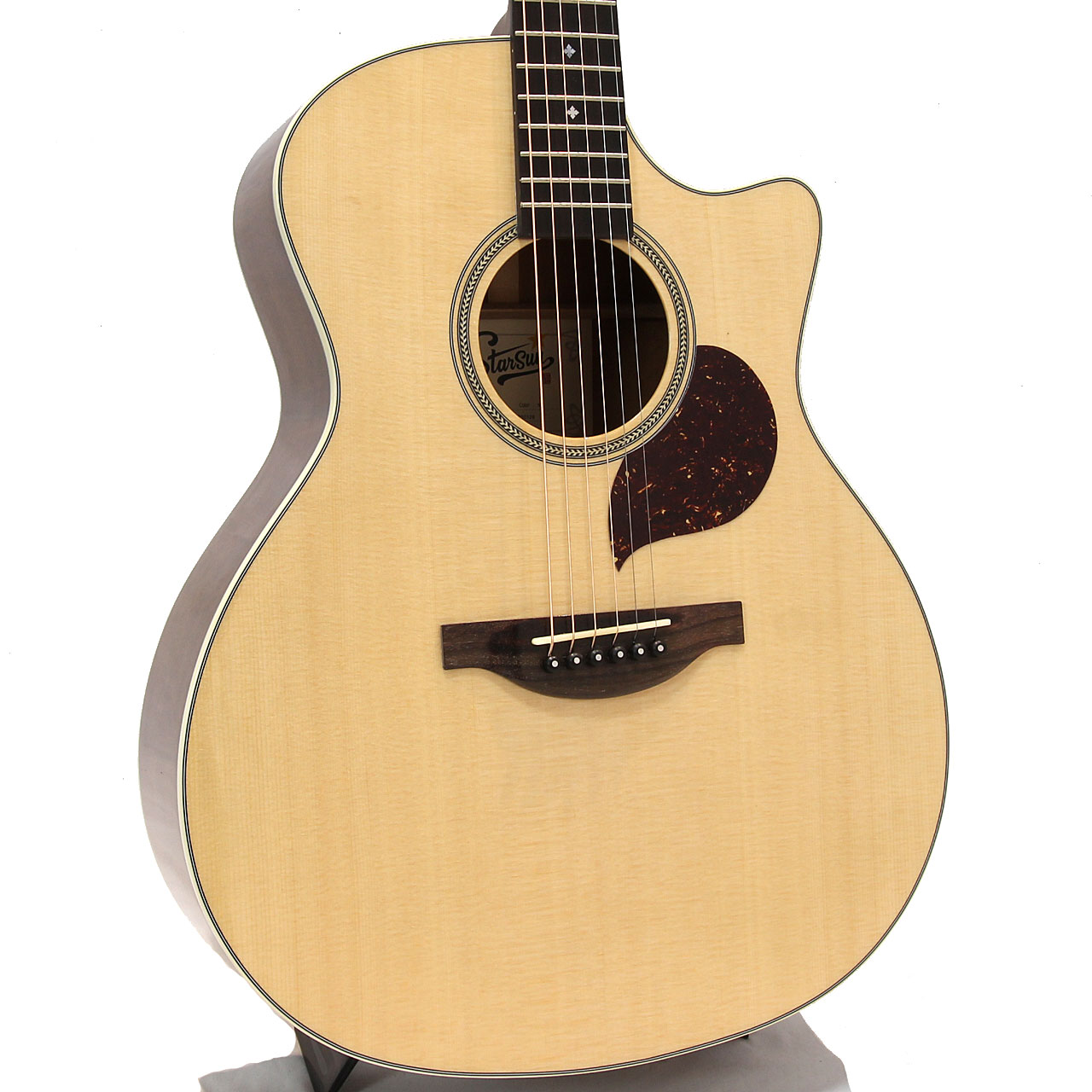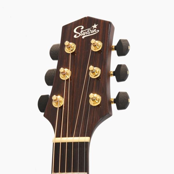トップ材はシトカ・スプルース、サイド&バック材はアフリカンマホガニーを使用。アフリカンマホガニーネック、ローズウッド材指板&ブリッジ、ヘリンボーンロゼッタ、ABSアイボロイドバインディング、Starsunオリジナル・チューナー、44mmナット幅、648mmスケール、エボニー材ブリッジピン、Camel Bone材ナット&サドル、極薄グロス・ポリウレタンラッカーフィニッシュの仕様となっております。