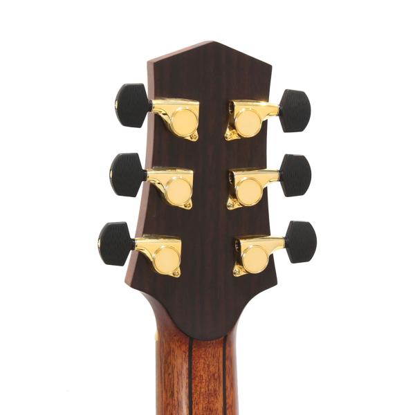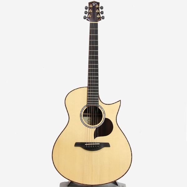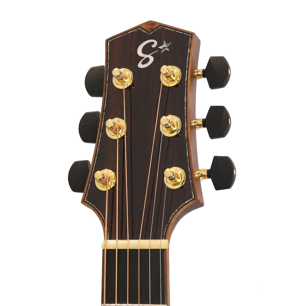 スペックですが、トップ材はAAAグレードのスイス"ムーン"スプルース、サイド&バック材もまたAAAグレードのインディアンローズウッドを使用。アフリカンマホガニー材とローズウッド材による5Pネック、エボニー材指板&ブリッジ、アヴァロンロゼッタ、コア材バインディング、埋め込み式ローズウッド材ピックガード、Starsunオリジナル・チューナー、44mmナット幅、648mmスケール、エボニー材ブリッジピン、Camel Bone材ナット&サドル、極薄グロス・ポリウレタンラッカーフィニッシュの仕様となっております。