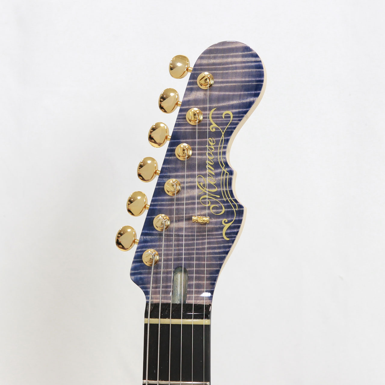 ディバイザーと言えば和材!!ということで今回は良い栃(トチ)が入ったとの事でしたので複数枚から更に厳選を重ねて、今回は細かで均整の取れたフレイム栃(トチ)をセレクトさせていただきました。杢の深さも充分でブルー系の陰影からくる奥行もしっかり出せました。左右からグラデーションを施す、ヴァーティカルグラデーションも上品で涼やかさのあるカラーリングに最良なアクセントを加えてくれました。ヘッドトップも同様の仕上げとして高級感アップさせております。
