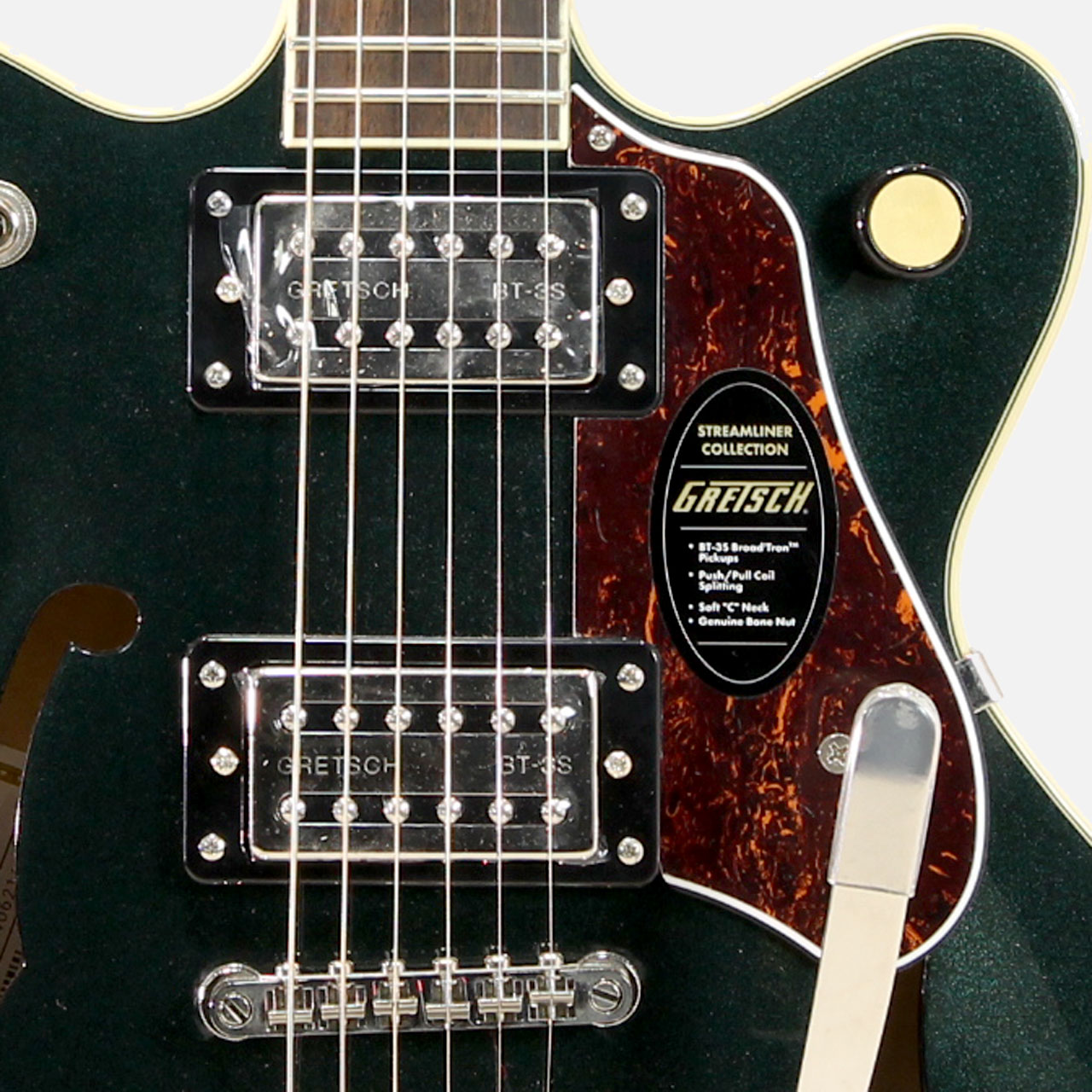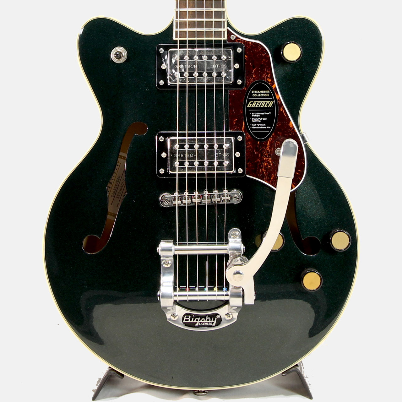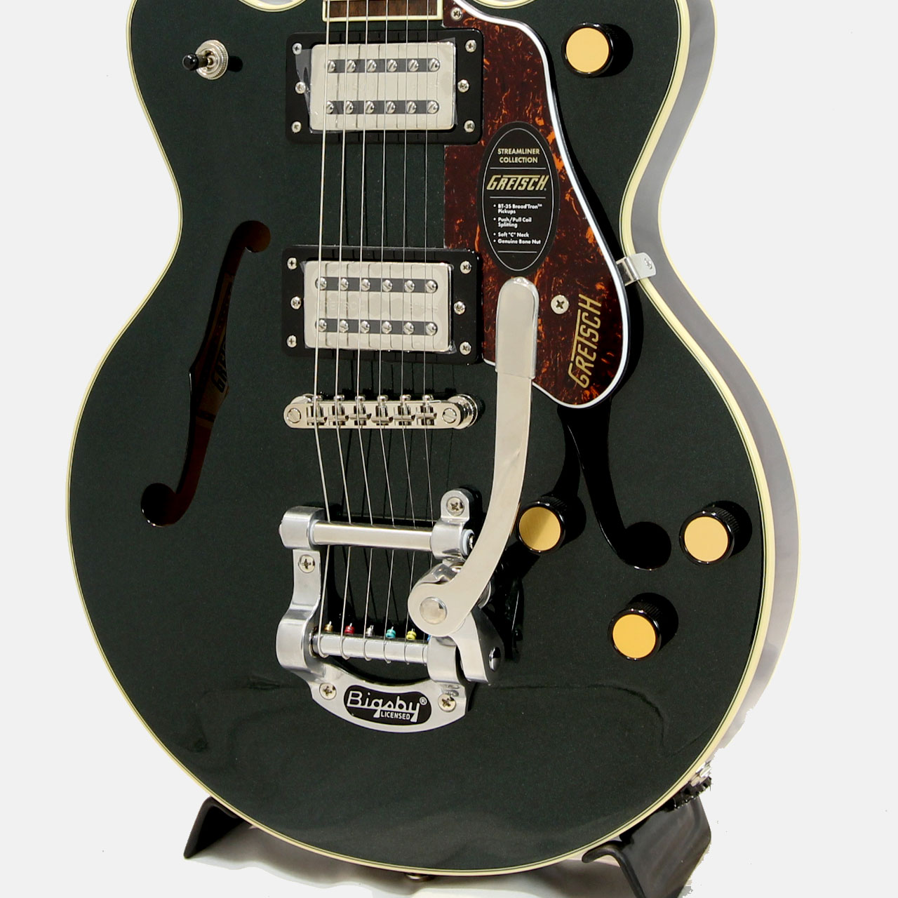 Gretschならではの高いデザインセンスはそのままにコンパクトに仕上げたボディサイズ。小さめのアーチドメイプルボディに新たなセンターブロックデザインを採用し軽量で快適な演奏性と存在感のあるリッチなサウンドを両立するように設計されており、アタックとサスティンを向上させております。軽量で取り回しも非常に良く、抱え込みもしやすいので長時間のプレイや小柄な方にもオススメです。ビグスビーもオシャレですね。