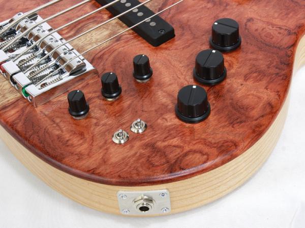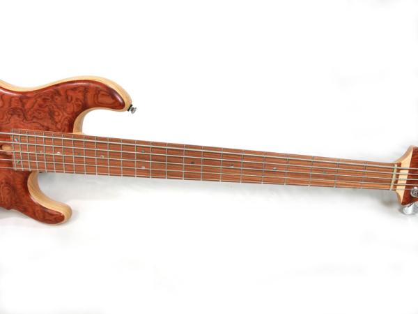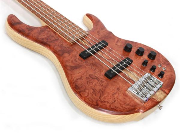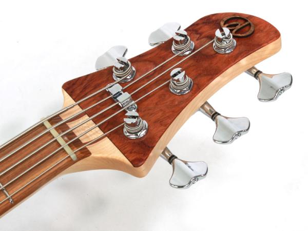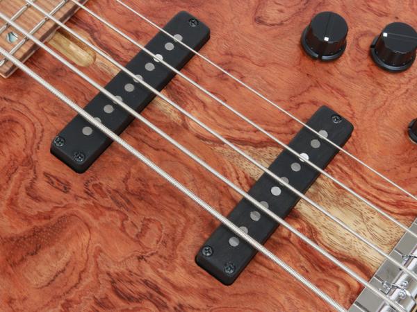 本モデルはボディに杢目の美しいブビンガ材とボディバックにはライトアッシュを採用した5弦ベース。その揺らめくような杢目とブビンガ特有の赤褐色が印象的な仕上がりとなっています。