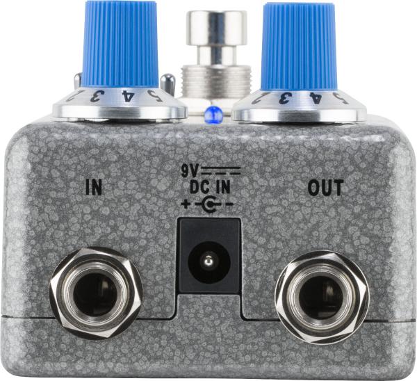 堅牢度の高いシルバーの 4.375” x 2.375” x 1.25”サイズの筐体にはペダルボード上での使用を想定し、インプット/アウトプットのジャックを上部にまとめるという工夫が成されています。