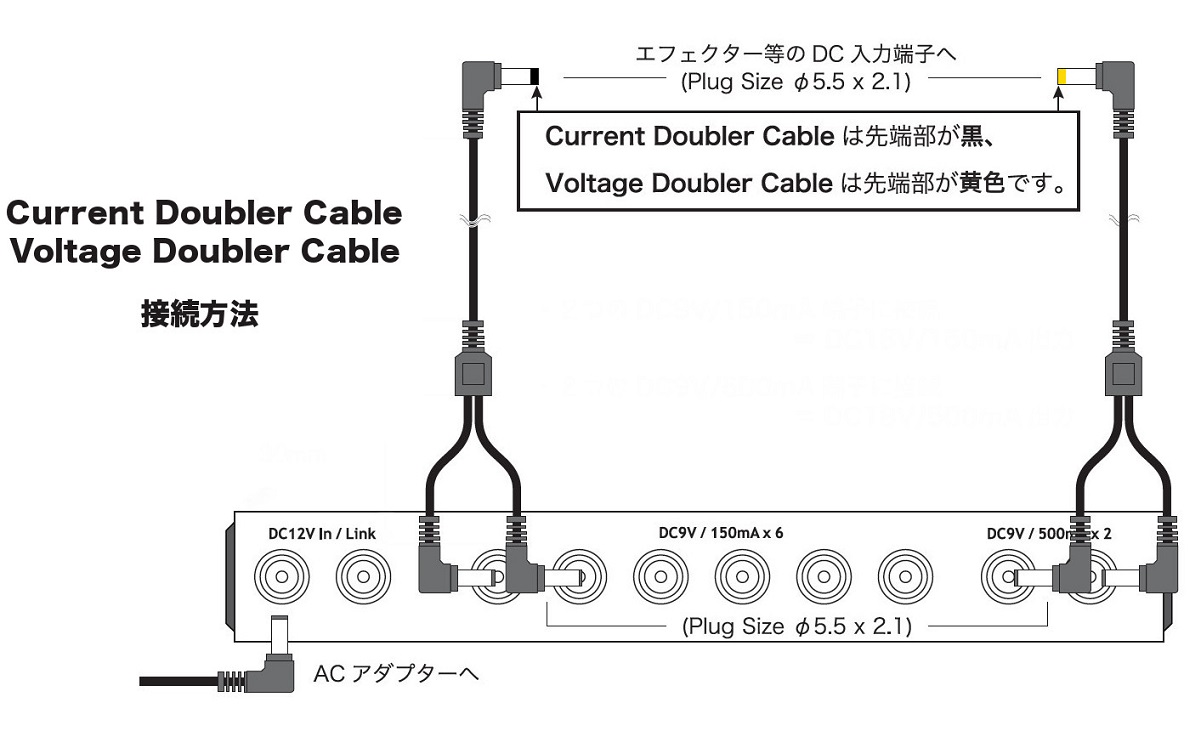 ・付属のCurrent Doubler Cableで供給電流150mA×2を300mA×1、500mA×2を1A×1へ